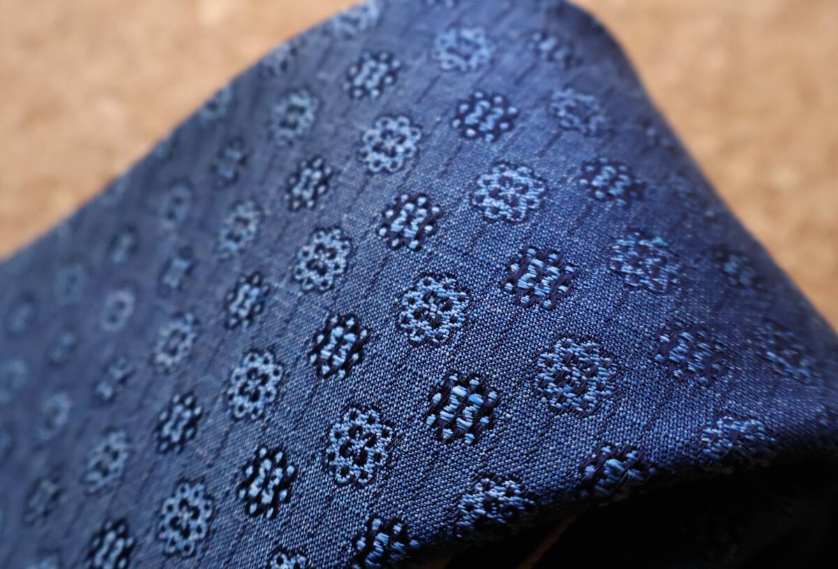 濃淡が異なるネイビーの糸で織られたフローラル小紋。ネイビーとライトネイビー(インディゴブルー)の2色のみで織られているため、小紋柄もベースの生地に同化して見え、シャドー小紋柄となっています。