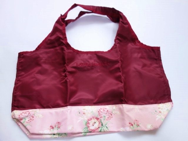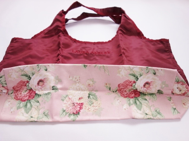 ☆ローラアシュレイのエンジ×ピンク地にバラ柄のエコバッグです。