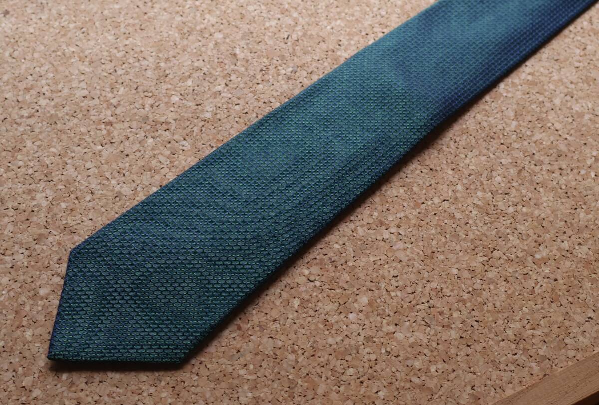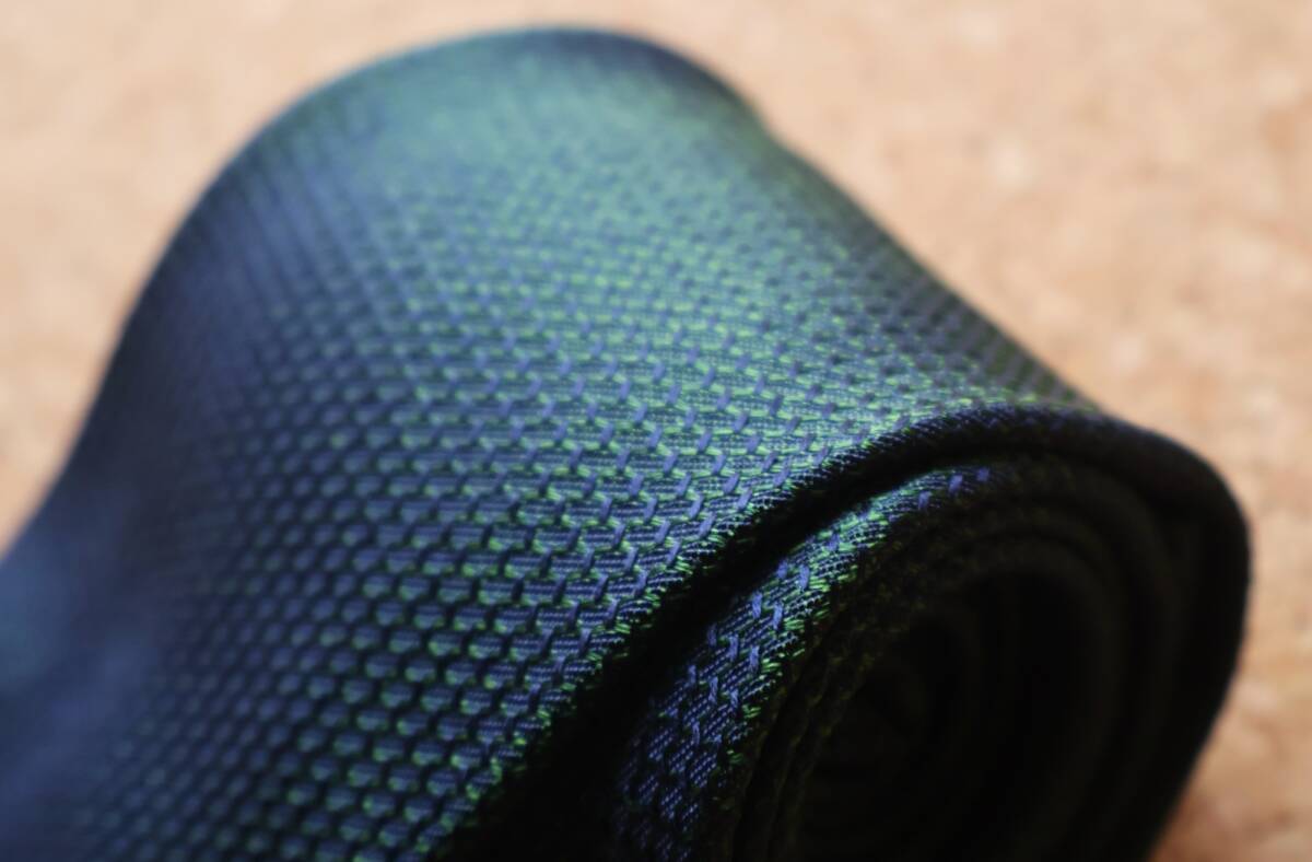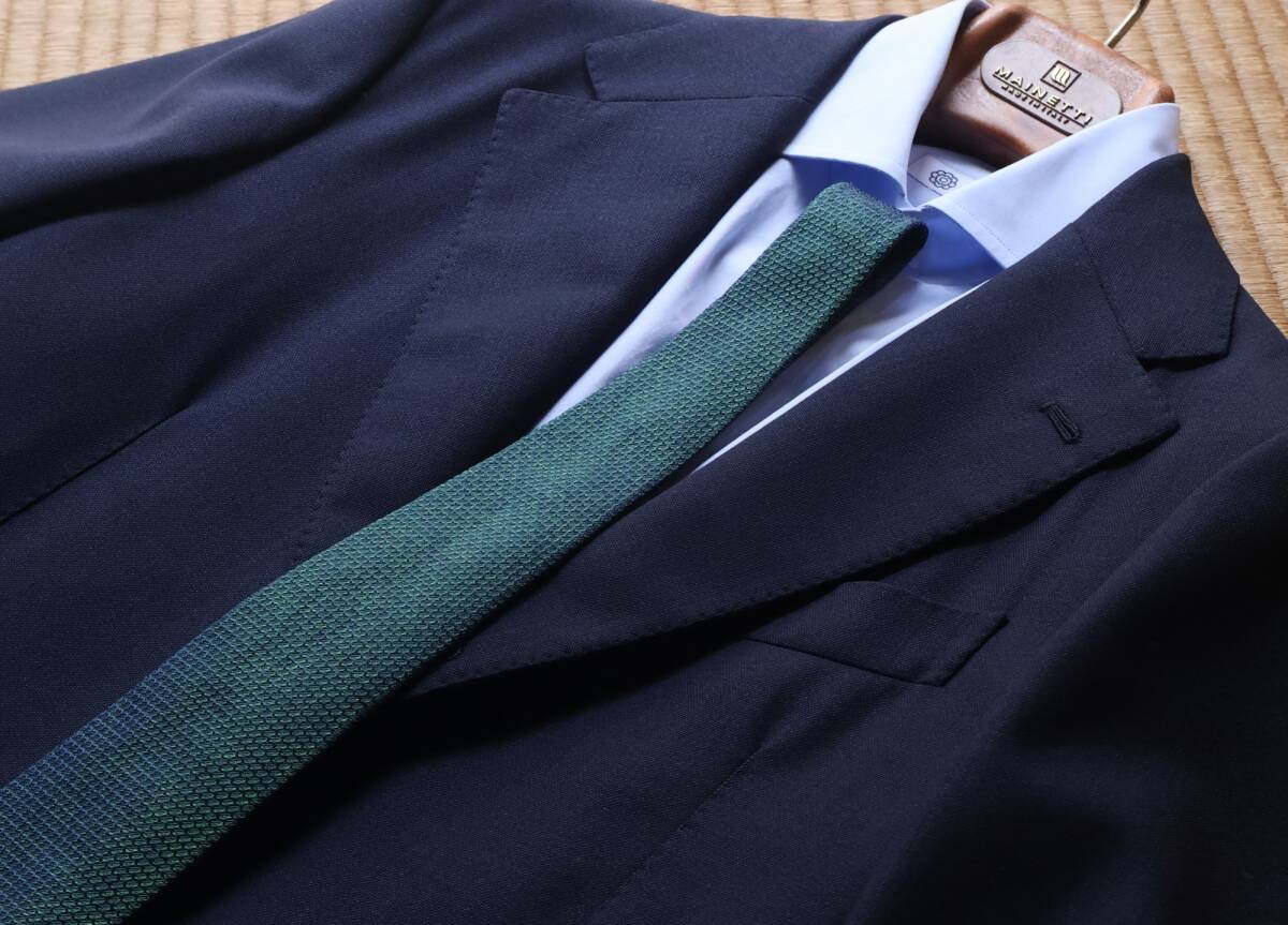 基本的にはダークグリーンの無地ですが、背後に隠れている糸にネイビーが使われているため、見る角度や光のあたり具合でネイビーの存在が浮かび上がり、全体的にネイビー寄りに見え、トーンの印象が変化します。