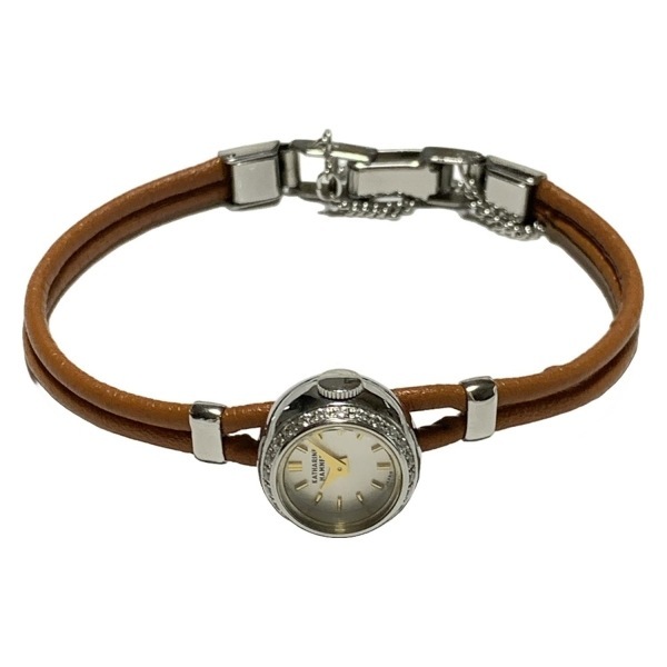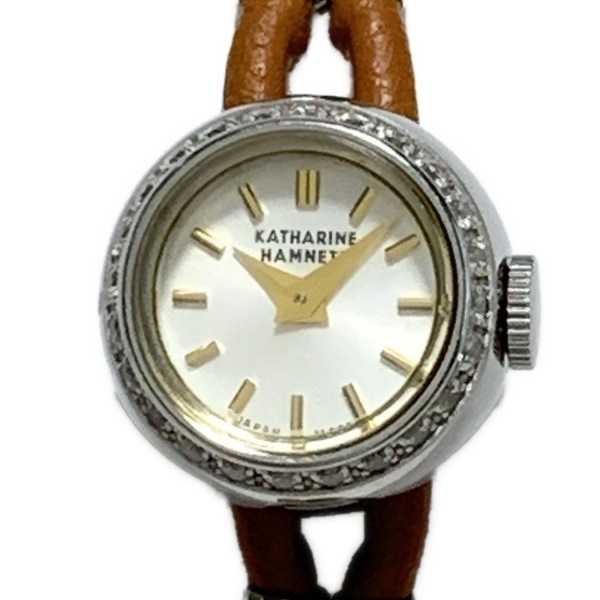 商品説明 ブランド:KATHARINEHAMNETT(キャサリンハムネット) 型番:KH-7072 コンディションレベル:【7】きれいめ 実寸サイズ フェイス : 約 1 cm × 1 cm ケース : 約 1.3 cm × 1.3 cm (リューズ含まず) ベルト幅 : 約 0.2 cm 腕周り : 約 16 cm 商品詳細 ジャンル:腕時計 デザイン:ラインストーンベゼル 文字盤カラー:シルバー ベゼルカラー:シルバー ケースカラー:シルバー ベルトカラー:ブラウン ベルトの素材:レザー 男女別:レディース ムーブメント:クォーツ 動作状況:【確認出来ず】 ※時計内部の状態確認がとれておりませんので、 故障している場合にはお客様ご自身で修理をしていただく必要がございます。 修理代負担・返品はお受けできませんのでご了承の上、ご入札くださいませ。 シリアル:9*** 付属品:なし付属品について コンディションの備考 ※あくまで商品の外観ダメージです。動作状況をご確認の上、ご入札くださいませ。 【ケース】 ・全体的 ⇒ 傷 / くすみ 変色 【ベルト】 ・全体的 ⇒ 傷 / 伸び/型崩れ ・裏面 ⇒ 劣化 【特記事項】 ・本体 ⇒ ニオイ