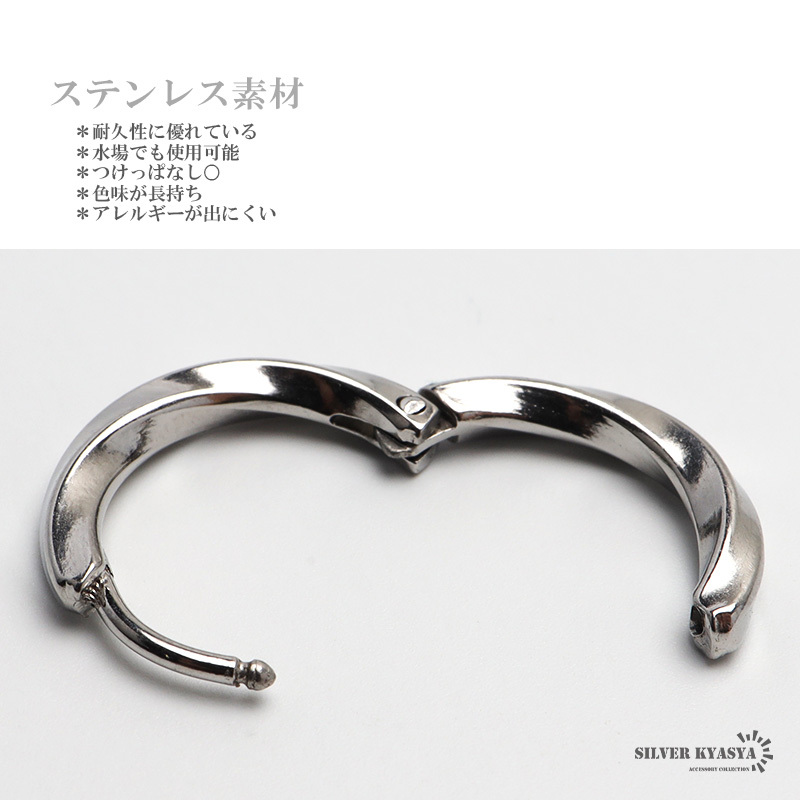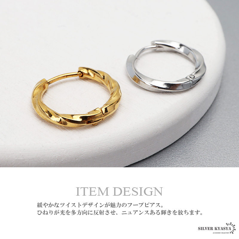 | 商品概要 | ■ITEM DETAIL 緩やかなツイストデザインが魅力のフープピアス。ひねりが光を多方向に反射させ、ニュアンスある輝きを放ちます。 ■ステンレス素材を使用 金属部分は頑丈なことで知られるステンレス素材を採用。耐久性はもちろん耐水性も高く水場での着用も可能。金属アレルギーも出にくいとされている金属です。 |