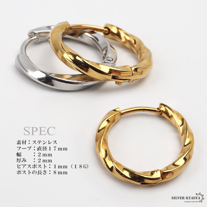 | サイズ | フープ:直径17mm 幅:2mm 厚み:2mm ピアスポスト:1mm(18G) ポストの長さ:8mm |