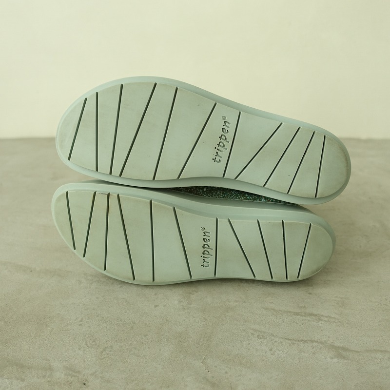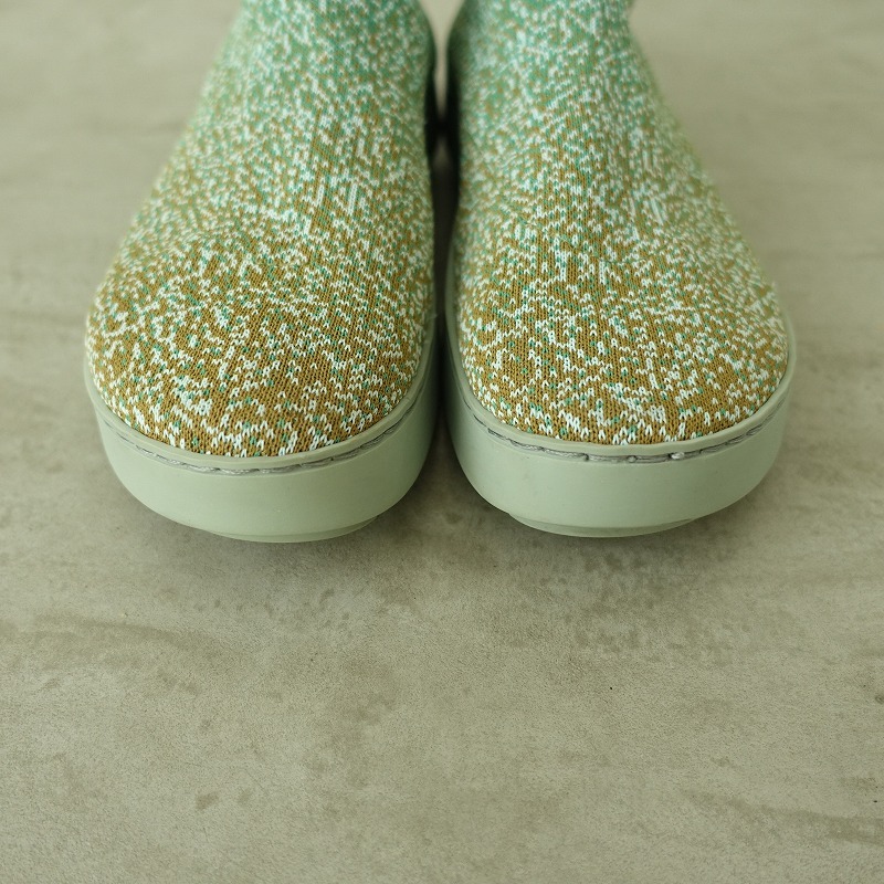 | trippenのSparkle ソックスブーツです。カラーはくすみグリーン・ブラウン・ライトブルーのミックスで、伸縮可能なニット素材であしらわれており、履き口はリブ仕様です。 |