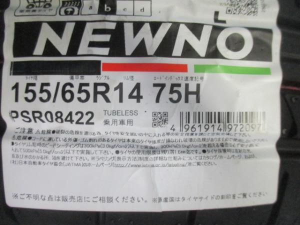 | タイヤ詳細 | タイヤ:ブリヂストン NEWNO サイズ:155/65R14 75H 製造 (年 1本目:2025年 2本目:2025年 3本目:2025年 4本目:2025年 コメント:※2025年製の新品タイヤです。 |