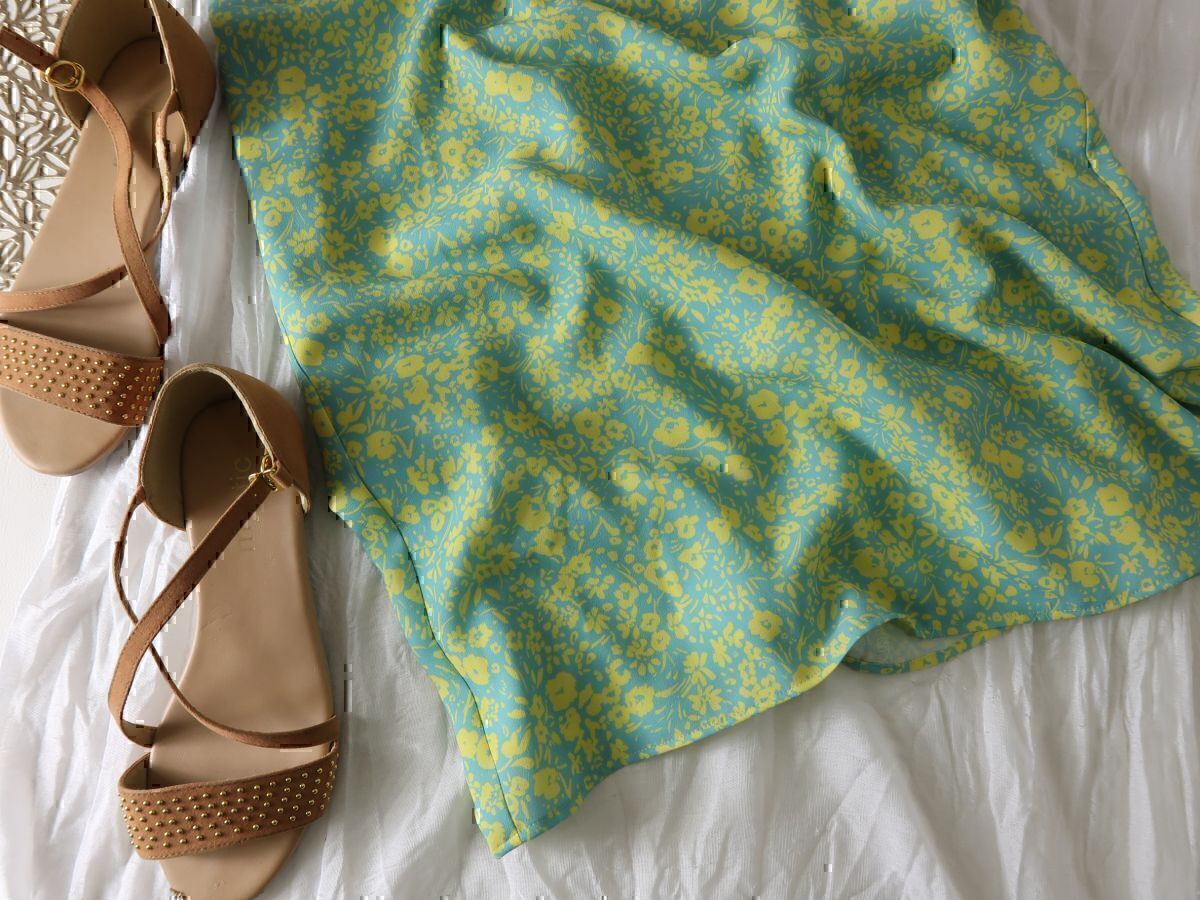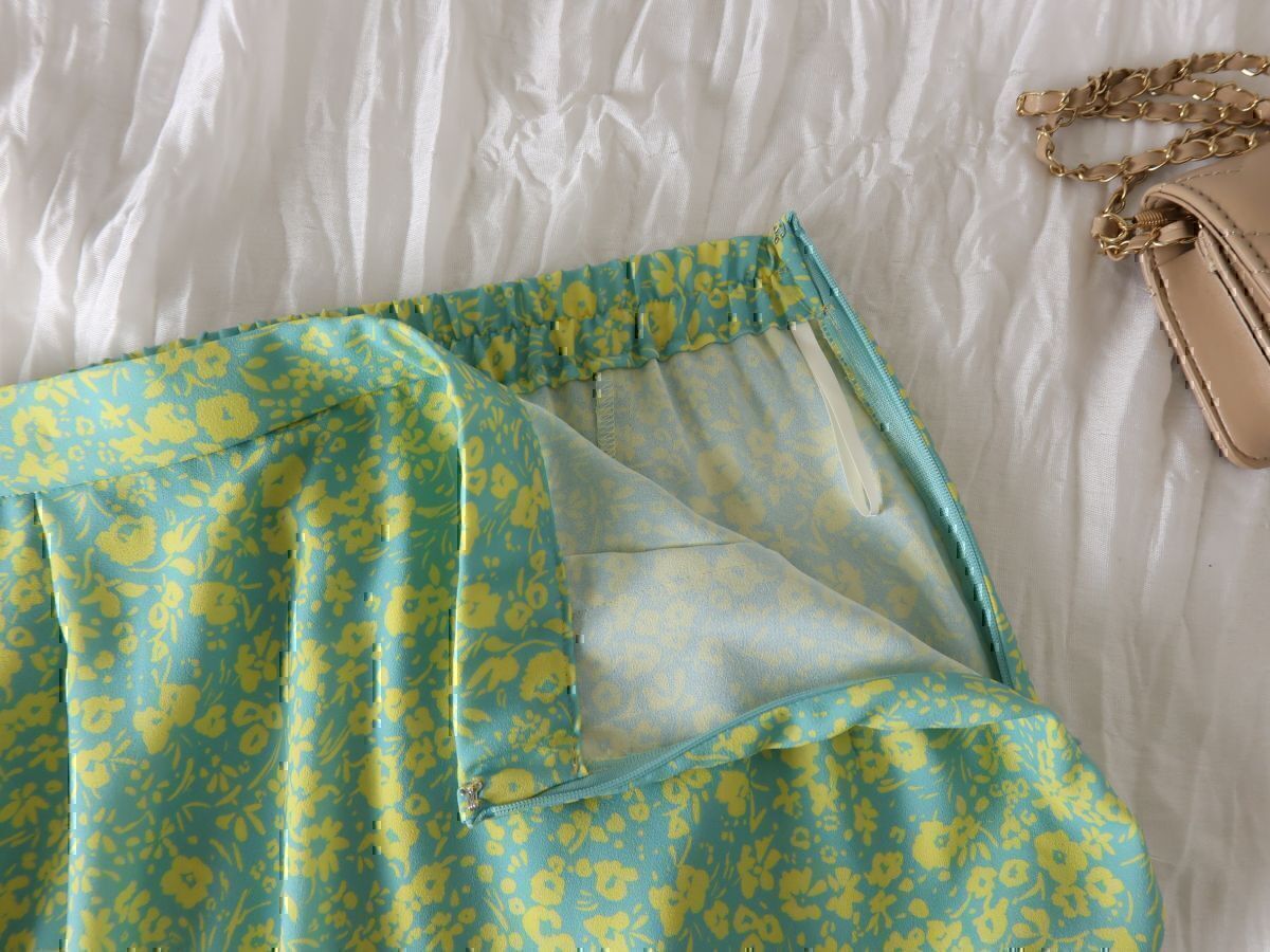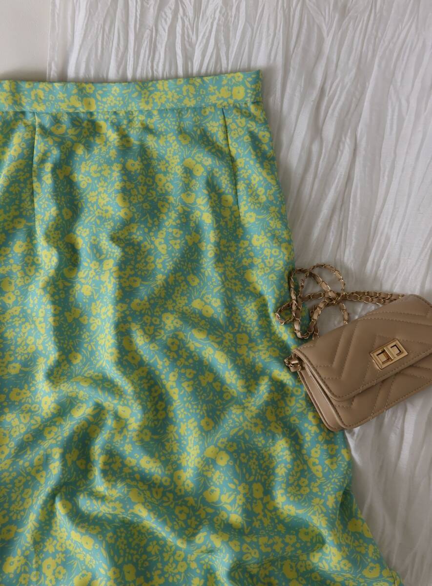 細かな凹凸が特徴の梨地素材に小花柄をプリントした軽やかなロングスカート。