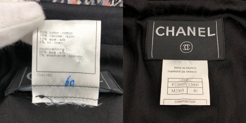 出品詳細を最後まで読んで頂き、入札をご検討下さい。 *********************** CHANEL シャネル ツイード ジャケット M2303 サイズ40 表記サイズ:40 肩幅:約39cm 身幅:約47cm 袖丈:約54cm 着丈:約61.5cm ※傷・毛羽立ち・解れ・タグに数字の書き込みがございます。 ※トルソー等は商品撮影用のため、商品には含まれません。予めご注意ください。 ※採寸は全て平置きで採寸しております。 *********************** 〇付属品につきまして ・商品説明文に記載していない場合、画像に写っているものが全てとなります。 〇動作確認につきまして ・「通電確認済み」と記載のある商品は通電のチェックのみ行っております。 詳細な動作確認は行っておりませんので、その旨ご了承の上ご入札下さいませ。 ・記載の無い商品は通電確認は行っておりません。 ・「動作確認済み」と記載のない商品は動作確認は行っておりません。 ※動作の保証はしておりませんので、ご了承の上ご入札下さいませ。 〇ご質問につきまして ・商品詳細にて不明な点がございましたら、入札前に質問欄にてご質問下さいませ。 ・専門知識を有する内容にはお答え出来ない場合もございます。予めご了承くださいませ。 ・入札の取消は出来かねますので、出品詳細をよくご確認の上ご入札下さいませ。 ※恐れ入りますが、ご落札後の質問にはご対応出来かねます。