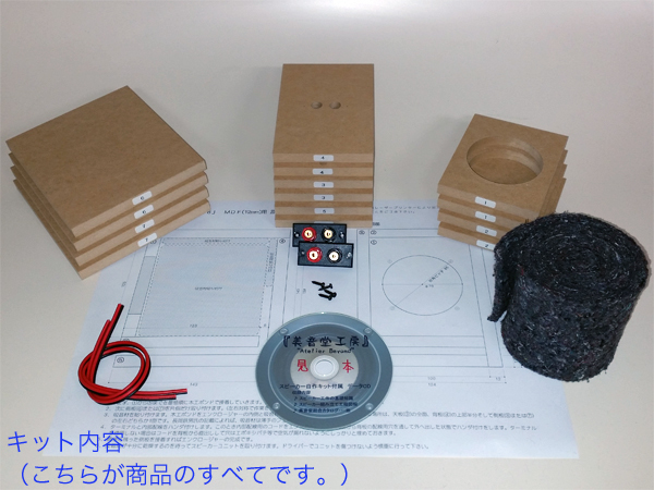 | ご覧いただきありがとうございます。 8㎝フルレンジスピーカーユニット用に、故・長岡鉄男氏が設計された小型のバスレフタイプ、ブックシェルフ型スピーカー『BS-8』のカット済み自作用キット(2本1組)です。 長岡氏による設計のユニット取り付け用の開口径を見直し、より多くの8cmユニットが取り付けられる汎用性の向上を図ったオリジナル設計になっております。 ※ご注意! この商品は後述のオプションパーツも含んだキット構成になっております。オプションパーツが不要な方は、別途出品しております「オプション無し」キットへの入札をお願いいたします。 スピーカーの自作にご興味のある方、いかがでしょうか? 自作スピーカーとしては最も簡単なタイプに属しますので、初心者の方でもそれほど苦労することなく製作できると思います。この機会に是非「自作」に挑戦してみてはいかがでしょうか? オリジナルの設計では厚さ14mmのラワン材の無垢板(棚板用材)によるものですが、この品物は厚さ12mmのMDFを使用しております。板材の厚みは薄くなっていますが、強度や比重はオリジナルのものより大きいため、品質で劣ることはありません。また、板の反りや割れに泣かされることもありませんし、材の品質が均一なため左右の箱で音が違うなどということも起こらず、余計な箱鳴りがない素直な音質が得られます。 完成時の寸法はW124mm×H169mm×D143mmと大変コンパクトですが、近年の8cmスピーカーユニットの基本性能の高さと相まって卓上用として使用すれば想像以上の素晴らしい音を奏でてくれます。 キットの内容はカット済み合板×一式(部材①から⑦まで各2枚ずつの14枚)で、バッフル板(前板)にはφ76mmの丸穴およびスピーカーユニット固定用ビスの下穴加工(対角ピッチ85mm)を施してあります。 これにより各社多くの8cmユニットの搭載が可能になっております。 <搭載可能ユニットの例> Fostex FE83NV、FF85WK(旧機種FE83En、FE83E、FE87E、FF85K、FE83、FE87等) TangBand W3シリーズ(ペーパーコーン、メタルコーン、PPコーン各種/一部不可あり) DIY AUDIO SA/F80AMG(マグネシウムコーン) beyma 3FR30、3FR30Nd Visaton FR8-8、FR8JS-8 さらに、下記のスピーカーターミナル、吸音材、内部配線コード等も同梱してあります。 オプションセットの内容は下記のとおりです。(写真2枚目参照) 1. スピーカーターミナル:ART TS-177 2個1組(バナナプラグ対応) 2. 吸音材:ニードルフェルト 12cm×90cm(厚さ10mm) 1枚 3. 内部配線用コード:0.75sq 30cm 2本 4. ターミナル(TS-177)に対応する取り付け用の穴加工(背板) また、キット本体以外の付属品として原寸図面(A3版)とデータCD-ROMを添付いたします。 データCD-ROMには写真を多用した組立工程解説書や『スピーカー工作の基礎知識』と題した工作法の解説書等をPDFファイルにて収録してありますので、初心者の方には大変参考になると思います。 ご注意! この商品にはスピーカーユニットは付属しておりません。ユニットは落札者様にて別途ご用意下さい。 キット販売ですので、製作に関するサポートはできませんので、落札者様の責任において製作して下さい。また、基本的にノークレーム、ノーリターンとさせていただきますので併せてご了承下さい。 | ||