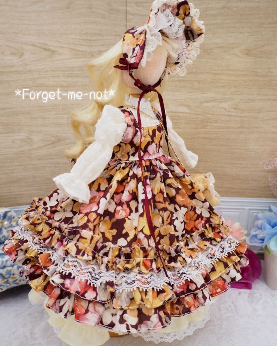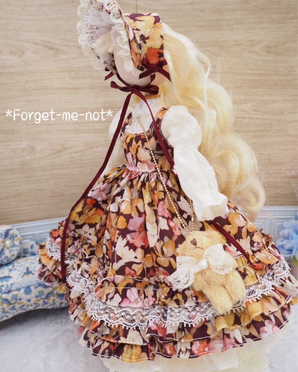 | たくさんある中からご覧いただきましてありがとうございます!トルソー着画のため、どうしてもスカートや袖の丈感等が分かりづらいかと思います。ご不便をおかけ致しますがどうぞ宜しくお願い致します 27センチドール、デフォルトボディに合わせて作りましたドレスのセットになります。(o^^o) 『~秘密の森と時を綴る装い~』 森が黄金色に染まる季節の装い。 深い森の奥にひっそりと佇む、秘密の隠れ家。そこで見つけたのは、アンティークの絵画のような、ノスタルジックな色合いのドレスでした。 生成り色の優しいワンピースは、まるで陽の光を浴びたように清楚な佇まい。そして、秋の光を閉じ込めたような花柄のジャンパースカートが、華やかさと深みを添えます。 柔らかなフリルとレースを贅沢にあしらったアウトフィットは、大切なドールをおとぎ話の主人公のように美しく彩ります。 この一着が、貴方とドールの特別な瞬間を優しく彩りますように。 貴方の大切なドールにぜひどうぞ。 ★ワンピース、後ろ半開マジックテープ留め ★アンダースカート、ウエストゴム。 ★オーバーワンピース、後ろスナップ留め。リバティ ★ヘッドドレス、リボンを結んでください。リバティ ★くまさん、市販のくまさんに飾り付けをしてボールチェーンを通しました。 以上の5点セットになります |