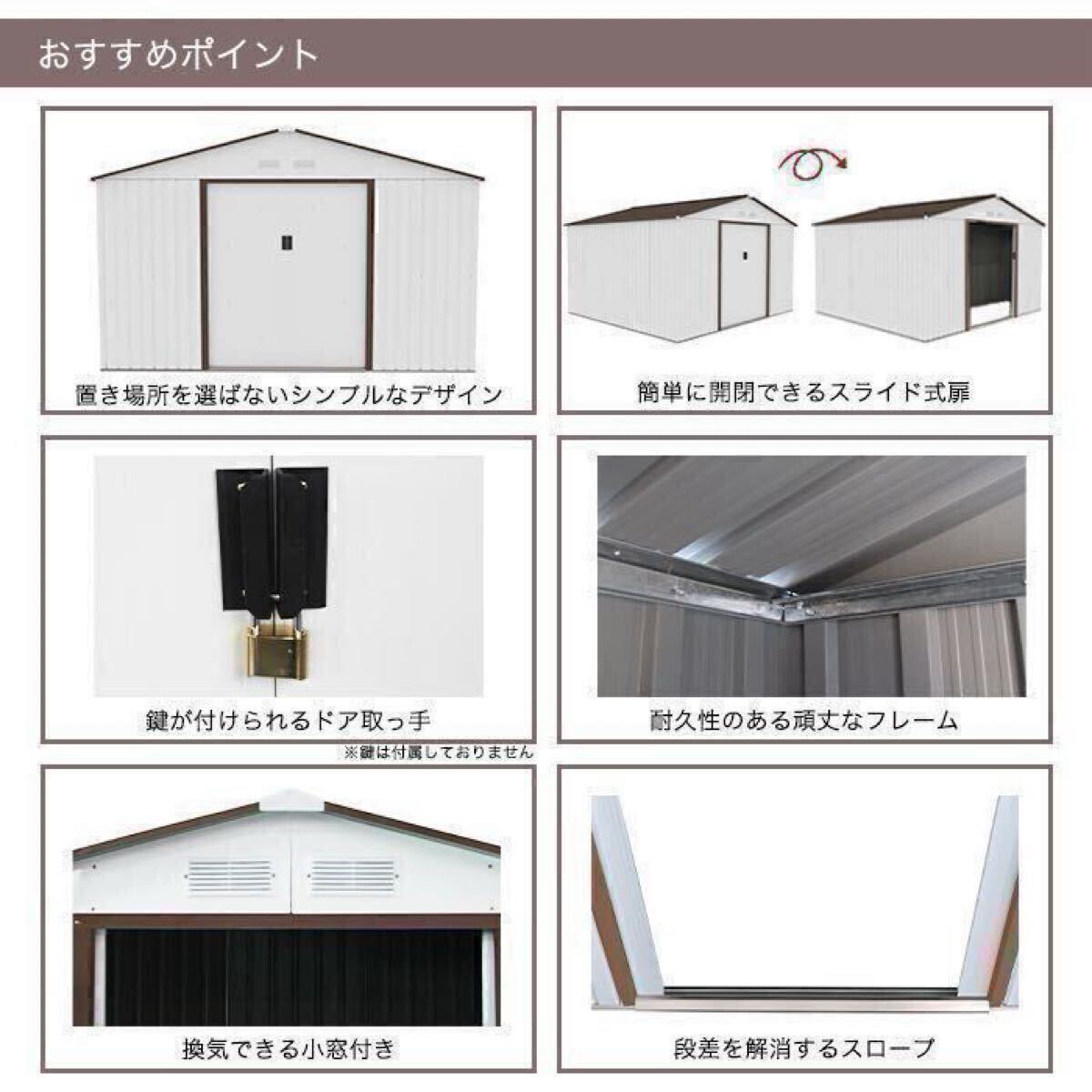 ※土日祝日の発送は致しません。 ※大型商品のため、必ず出荷前にお電話番号をお知らせ頂きます。(番号がないと出荷出来ません) 倉庫として自転車置き場として 頑丈設計なメタルシェッドです。 自転車置き場に、バイクガレージにもなる大型収納庫、 タイヤや釣り竿など趣味のアイテム、重量物、長尺物の保管に最適です。 スライド式の扉で開閉ラクラク♪ 出入り口にはミニスロープも付いています。 またスチール補強フレーム付きなので耐久性がアップしました ※こちらの商品は3個口での発送となります。 ※床材は付属しておりません。 【商品詳細】 素材:スチール サイズ(約):幅277×奥行き255×高さ202cm 重量(約):74kg 開口部サイズ:幅117×高さ162cm 【注意事項】 ※組み立てが必要になります。大人2名以上での組み立てを推奨いたします。 ※商品は新品ではございますが、運搬中に多少のスリ傷等あるかもしれません。また工場出荷時の状態で発送でのご発送となりますので、ご了承ください。気になさる方は、ご注文をお控えください。 ※商品輸送中にどうしても若干の傷、へこみ商品可能有凹損、塌陷,請下標前詢問清楚且注意。 などが出来る恐れが御座います。ご了承いただけるお客様のみご注文下さい。 ※床は付属しておりません。出入りが多く頑丈な床をご希望の場合は、 最寄りのホームセンター等で、ウッドフロア、コンクリートパネル等を お買い求めの上、設置をおすすめします。 ※大型商品の為、【日時指定】・【代金引換】はできかねております。予めご了承くださいますようお願い申し上げます。 ※設置場所に、搬入可能かどうか、サイズなどは必ずご確認ください。 ※実際の商品と上記の写真の色は、照明の関係上若干異なる場合があります。ご理解のうえご注文ください。 >