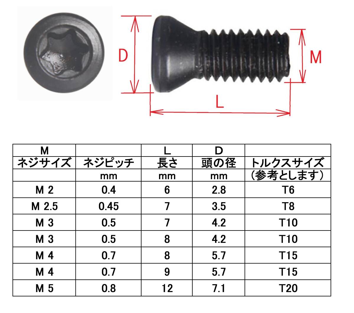 | 商品名稱 : | 10個 チップ押さえネジ チップ固定 M2/M2.5/M3/M4/M5 トルクスネジ |