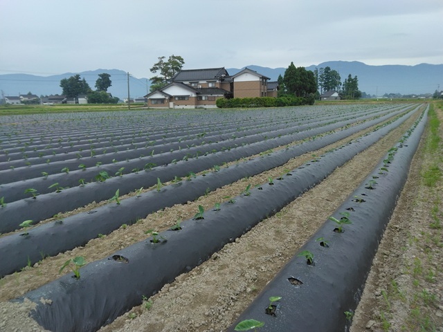 植うね全面を黒い生分解性マルチフィルムで覆って雑草が生えるのを防いでいます。