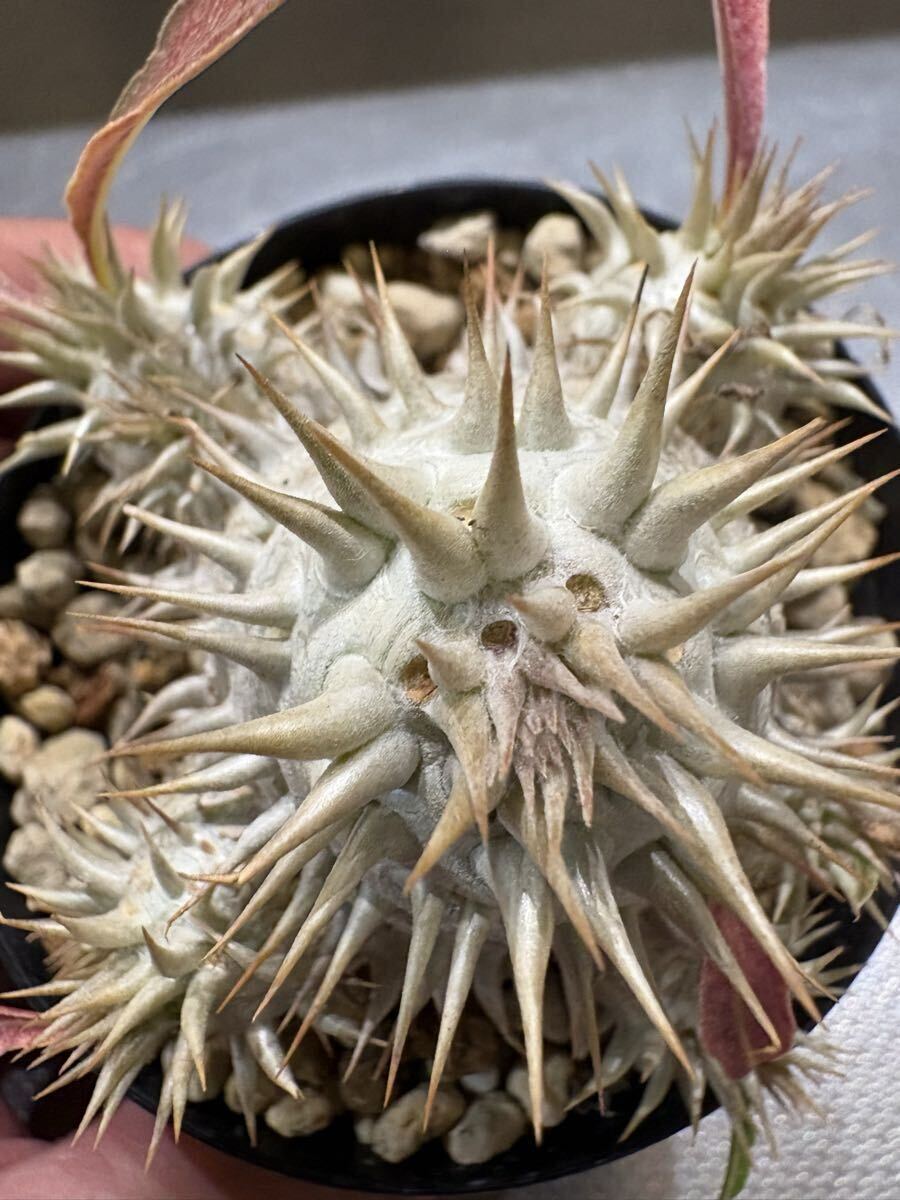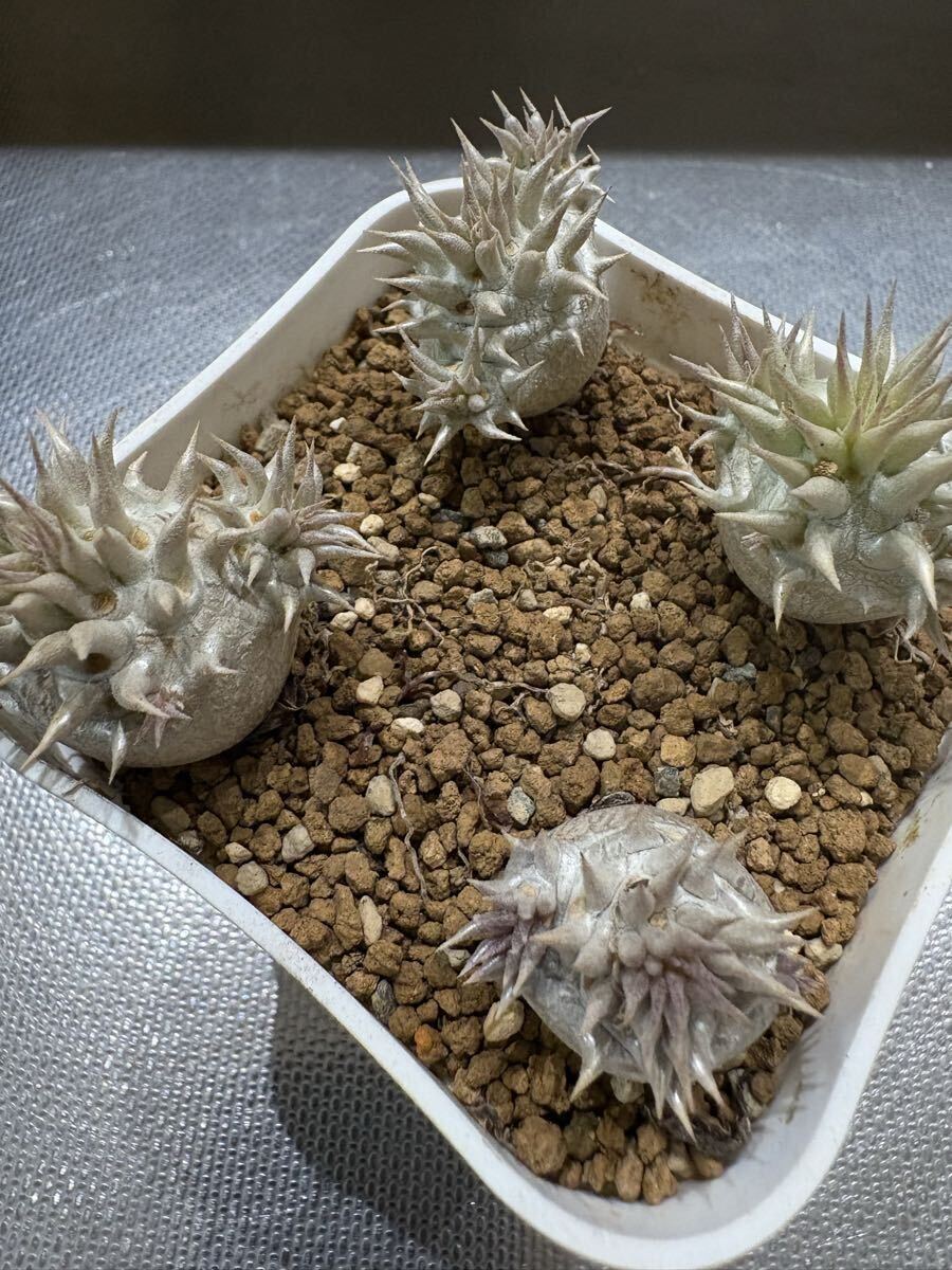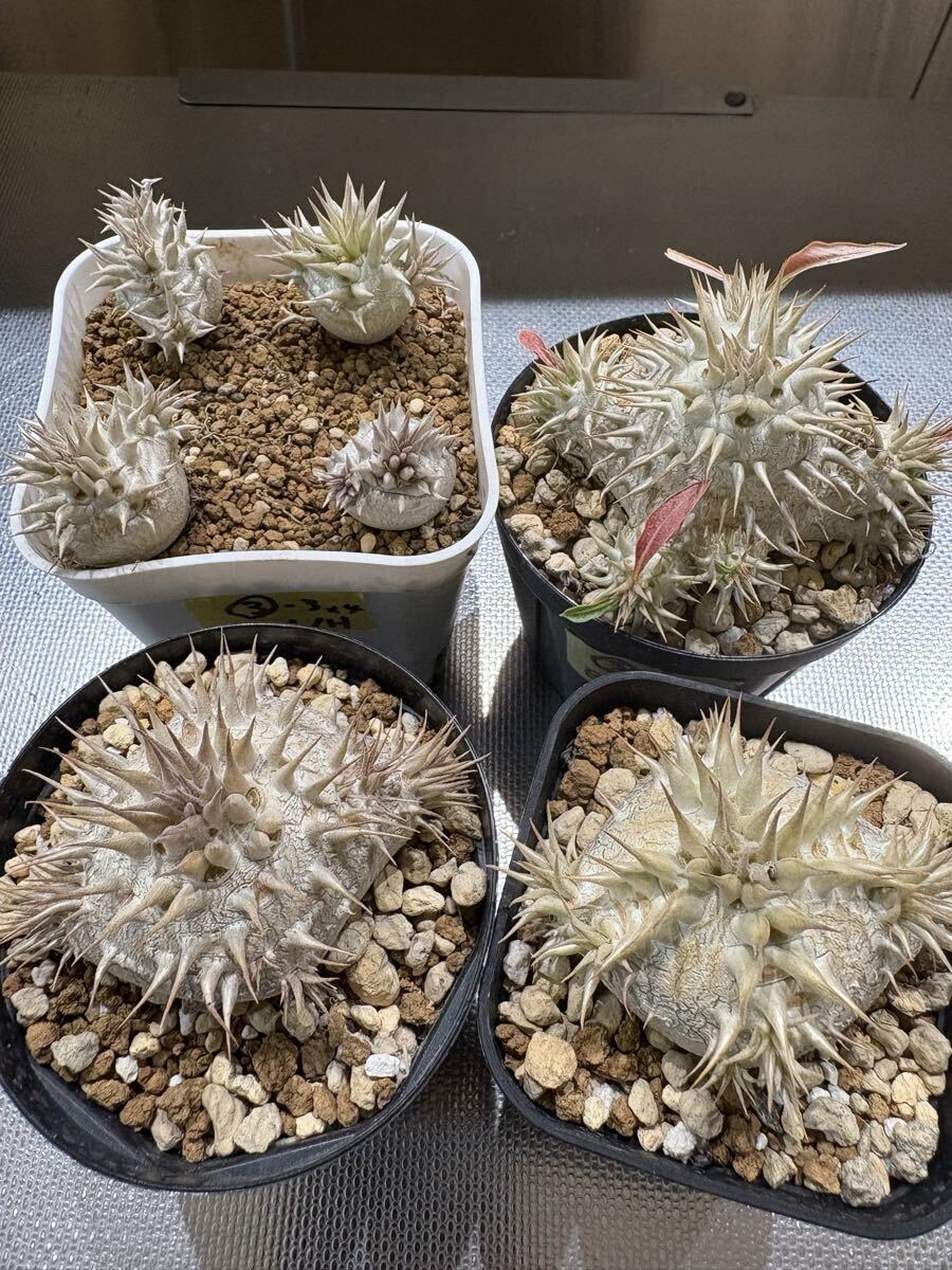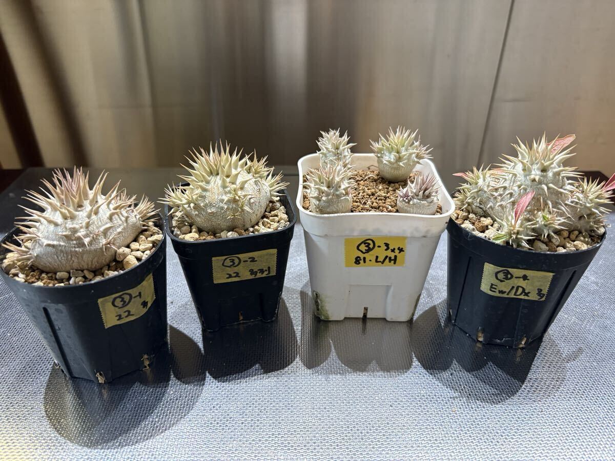 *朝晩が冷えてきてカクチペス以外落葉済みですが元気に生きています!上手く休眠できていると思います! 写真と到着時と葉っぱの感じが異なっていると思います根っこはパンパンなので元気ですのでご安心ください。 今は逆に発送しやすい時期でもあります! --- ◎78オリジナルハイブリッドのパキポディウムを含む豪華セットです! ・022番ハイブリッド(78hyb-022) 1歳半 78オリジナル「78魔界大黒」と呼んでいます。 私の定義としてロスラ系とブレビ系(一部扁平大黒も含む)のミックスを大黒としております。これは私の私見ですのでご容赦ください。何より、ボディーや葉や花の面白さを楽しむためのミックスです。こちら022系は未開花なので来季の開花が楽しみでなりません。ボディーは丸〜扁平〜生姜型と様々で可愛いです。 花粉親:実生丸葉マカイエンセ(両親山木、山木っぽい丸葉形質、dob氏産) 種子親:実生レウコキサンツム(両親山木、真四角の綺麗な形、鷲氏産) 両親の出所は信頼のおけるビッグネームなので,安心素材です。きっちり管理されていますので変な血が入っていることはないと思われます。 今回は,ご好評につき2株セットで出品です! 少し違ったタイプを選んでいます! 丸型スリット鉢75 ・081番ハイブリッド(78hyb-081) 今年作ったハイブリッドの初リリースです。 9株/鉢で播種し、成長が早いものを移植した残りなので歯抜け状態です。4株も載っていますのでお得かと。 花粉親がレウコキサンツム(鷲株)、種子親が実生ホロンベンセ、という面白いハイブリッドです,どんな形のどんな色の花が咲くか楽しみでなりません! 4株の中でも色の違いや形のバリエーションが見て取れます。 ハイブリッドの妙を楽しんでください! 来春個室を与えてやってください! プラステラ90 ---- 以下は、信頼おける大先輩の趣味屋さんから譲って頂いた種子からの自家実生株もしくは導入実生株です。 ・白エブ/ブレビカリックス(suzu産)1.5歳 花粉親:実生白花エブレネウム(大きめ丸花株か6花弁も咲くらしい株のどちらか) 種子親:実生ブレビカリックス 未開花なので花色花型は不明 兄弟株はぽってり丸型から多頭まで様々な形状があります! 丸型スリット75 (おまけ) 今季採種したパキポディウムハイブリッドもしくは純系の種子を5粒お付けします!選んでいただくことはできませんが、精魂込めて色々考えて作った面白いハイブリッドです。播種設備がない方もおられますので、必要な方は「オマケの種子希望!」と最初のメッセージで記載して下さい。 同日終了予定のほか出品物と同梱ももちろん可能です。即決で早くご落札いただいても、終了まではお取り置きしますので仰って下さい!同梱の場合梱包サイズが変わることがございます。ご落札後追ってお知らせします! (重要) 4株が上手く入る60サイズの段ボールがありませんので自分で段ボールサイズを調整しています。背の高さによっては少し葉が天井に付いた状態で発送する場合もございます。特に悪影響がないと思われる程度ですが、お気になさる方は、80サイズで発送しますので最初におっしゃって下さい! 出来れば作業の統一と窓口やレジでの煩雑さ解消のため、クロネコでの発送を選択していただけますと助かります! 気持ちの良いお取引を心がけております! 落札者様におかれましてもよろしくお願い申し上げます。 生体ですので速やかにお受け取りいただけるようお願いします。季節の変わり目なので輸送中に葉が落ちる可能性もありますが、普通のことです。ノークレイムノー返品でお願いいたします。 >
