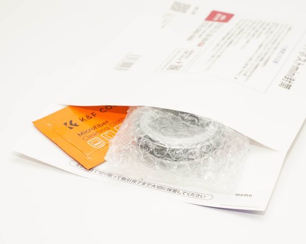 こちら本体付属するプラスチック製の元箱が付属しません。発送はゆうパケットポストミニになります。プチプチにマウントアダプターを梱包してレンズクロスと一緒に入れて発送になります。