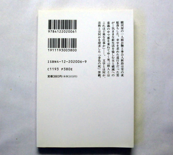 | 内容 | 駿河屋の一人娘お艶と奉公人新助は雪の夜駈落した。 幸せを求めた道行きだった筈が…。 芸術とは何かを探求した「金色の死」併載。 〈解説〉佐伯彰一 |
