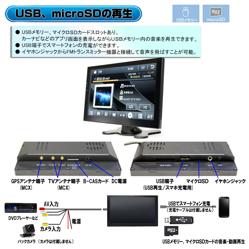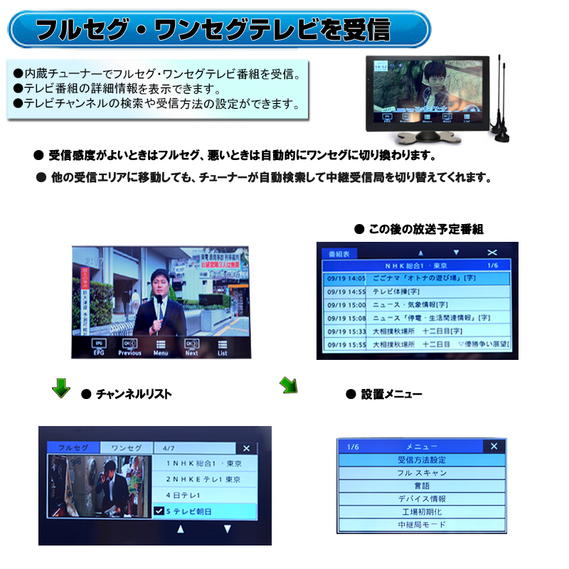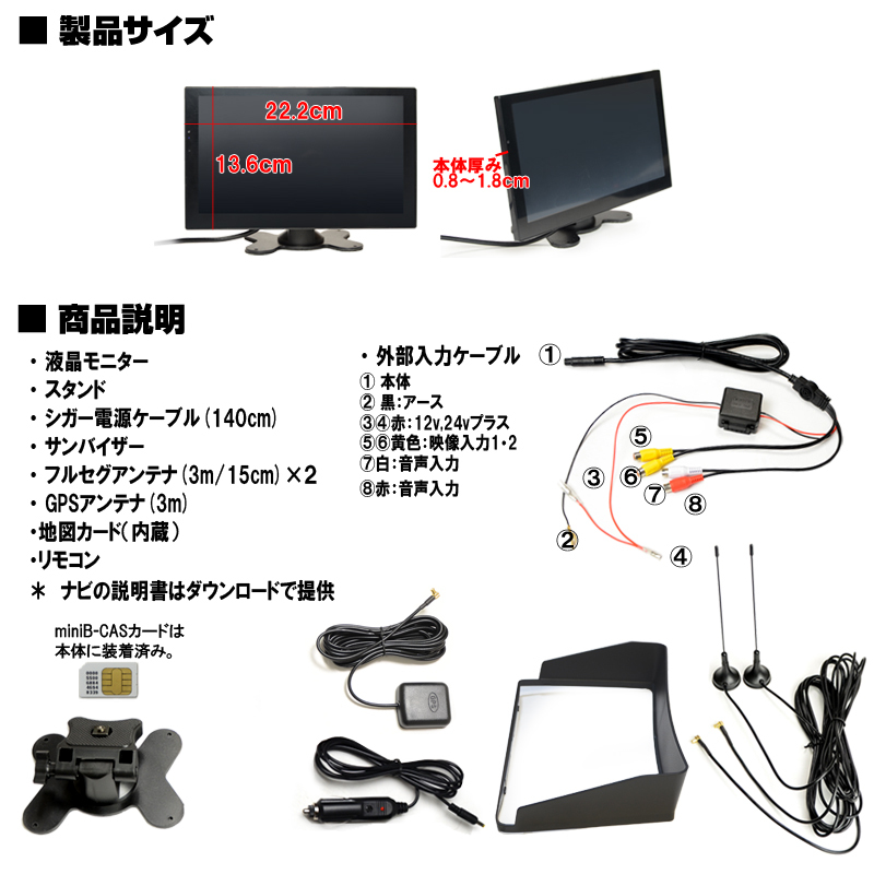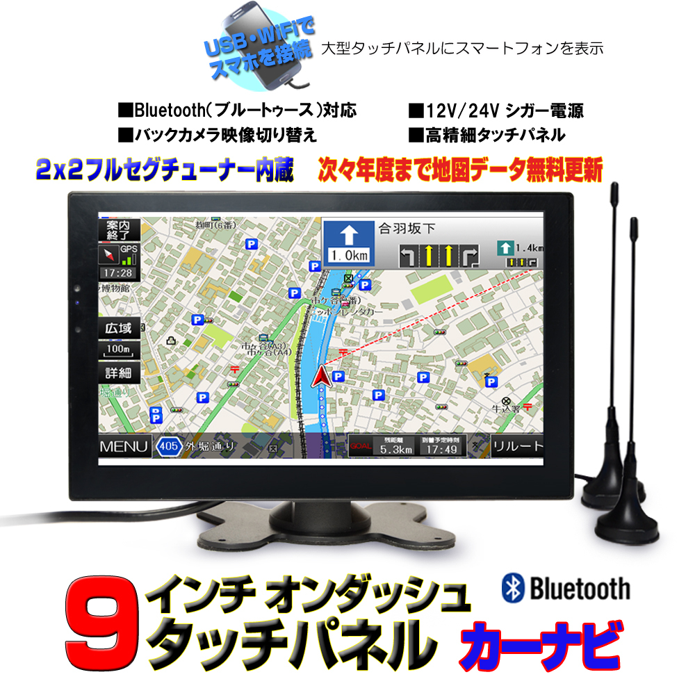 最新ナビ搭載 9インチの大画面ポータブルカーナビ。 高精細タッチパネルでかんたん操作。 チューナー内蔵でフルセグテレビを受信。 内部電源またはシガー電源が利用できます。 ブルートゥースでハンズフリー通話+スマートフォンの音楽再生。 iPhone,スマホとリンクして、音楽、動画表示することができます。 ※iPhoneは、画面表示ができるバージョンとできないバージョンがございます。 外部入力はAv1,Av2、2系統、バックカメラは自動切り替え § 商 品 詳 細 § 本体カラー: 黒 液晶サイズ :タッチパネル9インチワイド液晶 画素数 :800(H) x RGB x 480(W)画素 スピーカー :モノラルスピーカー内蔵 オート電源 :対応 操作メニュー: 日本語 ビデオ入力 :2系 電源: DC12V/24V 付属品: モニター本体、8GB地図SDカード、B-CASカード 電源・映像音声入力ケーブル、12V,24Vシガー電源線 リモコン、GPSアンテナ、TVアンテナx2本 スタンド、サンバイザー *オプション: 高感度アンテナ2本¥2580 バックカメラ¥2380 トラック用24Vバックカメラ¥4380 落札後 取引きナビよりご連絡ください。