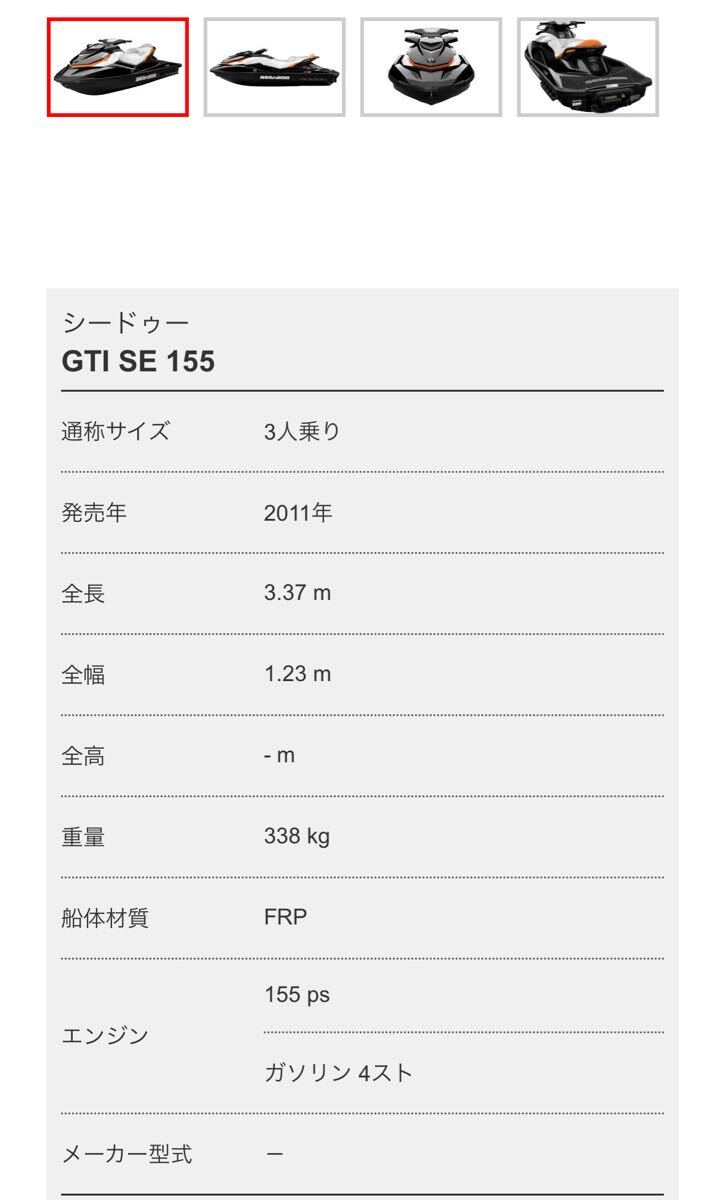 ※画像のトレーラーは借り物ですので付属致しません。 船体のみの出品です。 代理出品ですがお渡し完了まで責任を持って当方が行います。 水上バイクはあまり詳しく無いので専門的なご質問にはお時間頂きます。 昨年当オークションで購入したそうです。 当時アワーメーター38h 現在41h 免許取得し購入後2度乗りました。 生活環境の変化が理由で手放すそうです。 次回検査も10年9月なので長いです。 2度海で乗りましたが時間をかけてソルトアウェイで洗浄しました。 前オーナーは淡水使用と聞いています。 玉数少ない希少なseadoo GTI SE 155馬力です。 2011年式 NAなので燃費も良いです。 最後に乗った9月中旬にしばらく乗ってたらチェックランプ点灯でIBRが動かなくなりましたが、エンジンを一度切ったらすぐ治りました。 その後しばらく調子良く乗っていましたが再度同じ症状が出たみたいです。 その時も一旦エンジンオフで治りました。 今現状は普通にエンジンかかり、チェックランプも点灯していません。 船体には多少の傷はあります。 エンジンルームはキレイです。 エンジン上部カバーが購入時より無かったです。 ウェイクポール付いてますが伸ばした状態でロックしません。 シートも社外品商品無法判斷是否為正規品 に交換されているので滑りづらいです。 船体番号上部のボデー黒い部分少し塗装浮きがあります。 水物の中古品なのでいかなる場合も返品、クレーム等受付できません。 現状販売の3Nでお願い致します。 トラブル防止のため可能な限り現車確認をお願い致します。 発送はできませんので引取商品有可能只能自取,自取費用相當高,請查看頁面確認 り限定限定自取商品請先聯繫賣家確認發送方式,若確認可以寄送會產生額外費用。 でお願い致します。 名義変更完了まで保証金30000円をお預かり致します。 名義変更は2週間以内にお願い致します。 お支払後名義変更してからのお引取商品有可能只能自取,自取費用相當高,請查看頁面確認 りの場合は保証金は不要です。 変更完了後即日ご返金致します。 落札後のキャンセルは50000円のキャンセル料を頂きます。 ご検討よろしくお願い致します。 >