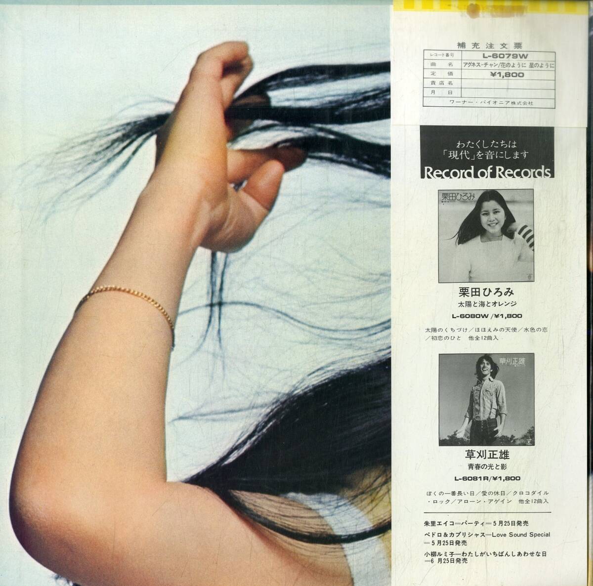 商品情報 アーティスト アグネス・チャン(陳美齡) タイトル 花のように 星のように (1973年・L-6079W) 番号 L-6079W 種類 LP1枚 プレス JAPAN 管理No. A00582572 付属品 ブックレット カレンダー コメント 見開き