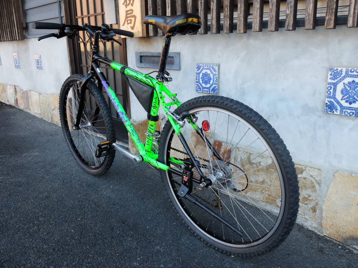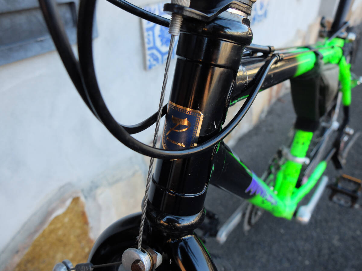 車体色は蛍光色のアップルグリーンに黒で斑点状のカスタム古董商品,有可能客製化、修改、換過零件,請下標錢注意。 ペイント フォークを含む前方とフレームエンドにかけては艶黒のボカシ塗装のビビットな車体色です。