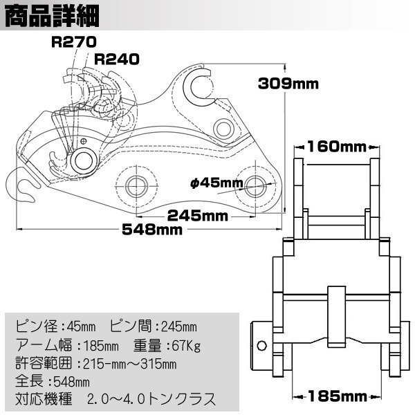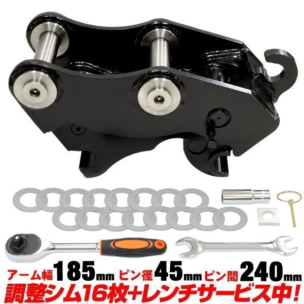 | ユンボ・建機・重機用 バケット 交換用 クイックヒッチ ファストロック クイックロック アタッチメント ピン径45mm ピン間240mm アーム幅185mm |