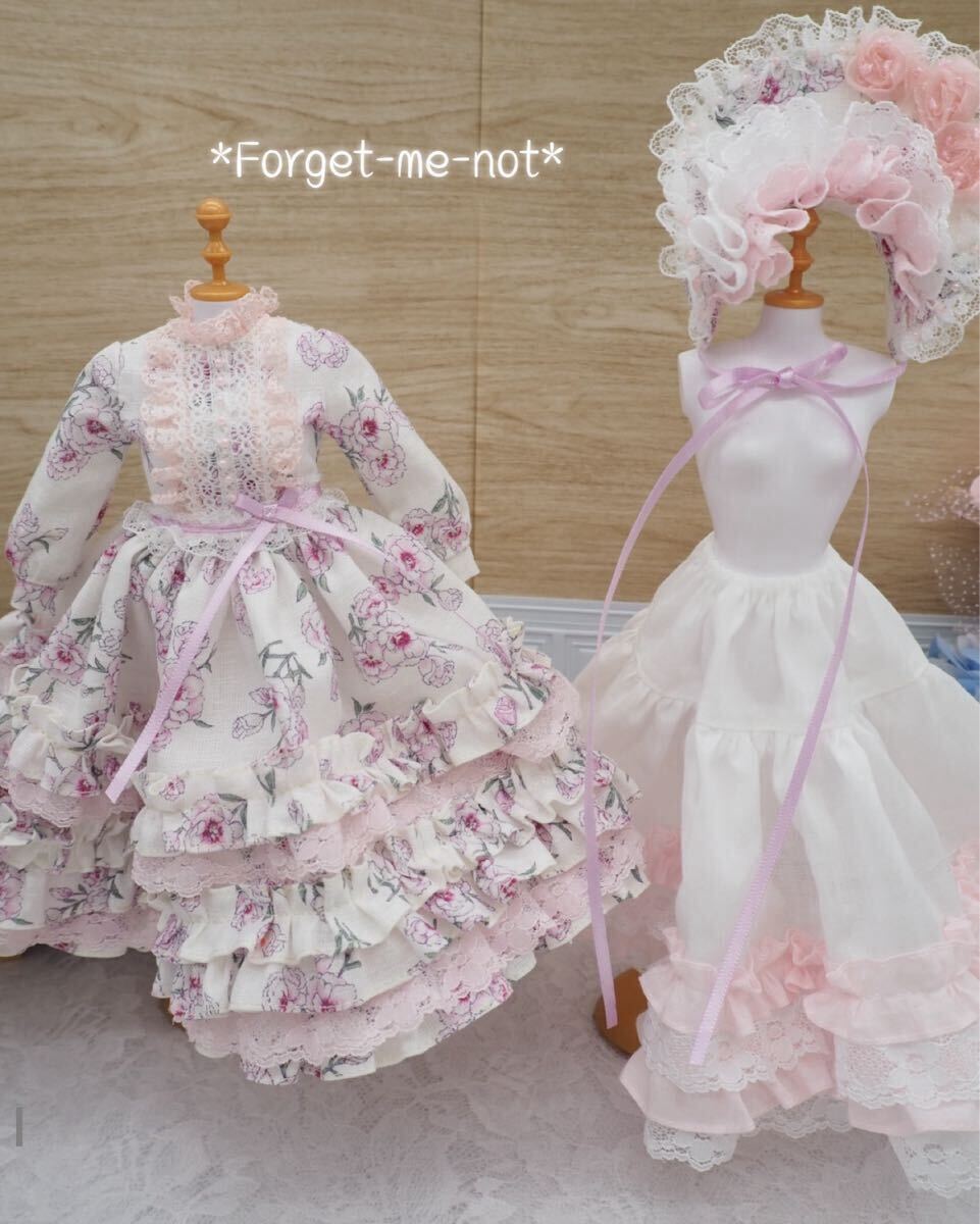 | たくさんある中からご覧いただきましてありがとうございます!トルソー着画のため、どうしてもスカートや袖の丈感等が分かりづらいかと思います。ご不便をおかけ致しますがどうぞ宜しくお願い致します 27センチドール、デフォルトボディに合わせて作りましたドレスのセットになります。(o^^o) 『~リボンとフリルのスウィートロマンス~』 繊細なペールトーンの花柄に、生成りのレースとピンクリボンを贅沢に使用したドール用ロングドレスとボンネットのセットです。 たっぷりの生地を使った3段のティアードフリルとスカラップレースが特徴で、ボリューム感あふれるクラシカルでロマンティックなシルエットを生み出します。お揃いのボンネットが、お顔周りを華やかに飾ります。 この一着が、貴方とドールの特別な瞬間を優しく彩りますように。 貴方の大切なドールにぜひどうぞ。 ★ワンピース、後ろ半開マジックテープ留め。 ★アンダースカート、ウエストゴム。 ★ハーフボンネット、リボンを結んでください。リバティ 以上の3点セットになります |