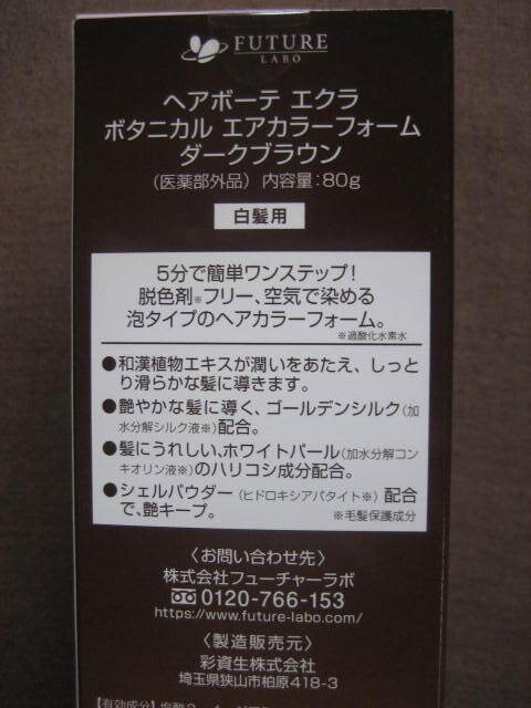 | 商品名稱 : | ☆★ヘアボーテエクラ ボタニカルエアカラーフォーム ダークブラウン 5箱 白髪用 白髪染め フューチャーラボ★☆ |