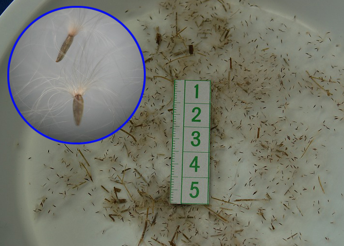 うな部分に種ができ、秋に熟すと上から下にたてにさけて、小さな綿毛の付いた種が風に乗って飛