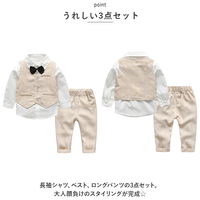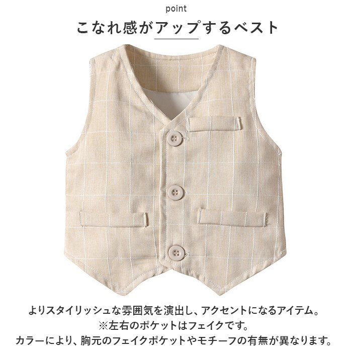 | 商品説明 | ・・コーデに悩むことなく、おしゃれにキマる!キッズ用(男の子)フォーマル3点セットが新登場。 ・【うれしい3点セット】 ・長袖シャツ、ベスト、ロングパンツの3点セット。大人顔負けのスタイリングが完成☆ ・【ベーシックな長袖シャツ】 ・フロントボタン付きの、スタンダードなカタチに仕立てたシャツ。襟元に縫い付けられた蝶ネクタイがポイント。 ・【こなれ感がアップするベスト】 ・よりスタイリッシュな雰囲気を演出し、アクセントになるアイテム。(※左右のポケットはフェイクです。カラーにより、胸元のフェイクポケットやチーフの有無が異なります。) ・【ストレスなく履けるロングパンツ】 ・締めつけ感の少ないバックゴム&フロントボタン仕様。着替えがしやすく、自分サイズにフィット!左右にポケット付き。(※フロントボタンは、カラーによりフェイクです。) ・【色々なシーンで活躍】 ・カジュアルライクなデザインで、デイリー使いからフォーマルシーンまで!幅広く活躍☆ |