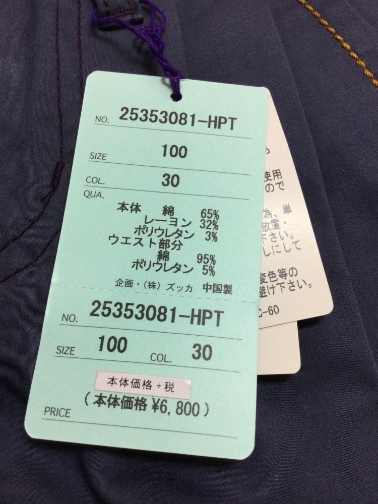 表示サイズ100、タグ記載の価格は6800円+税 |