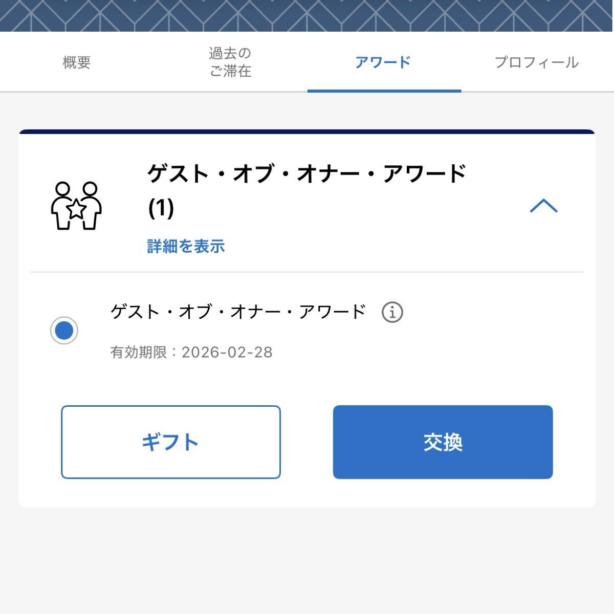 ワールドオブハイアット/ゲストオブオナーアワード1部屋分