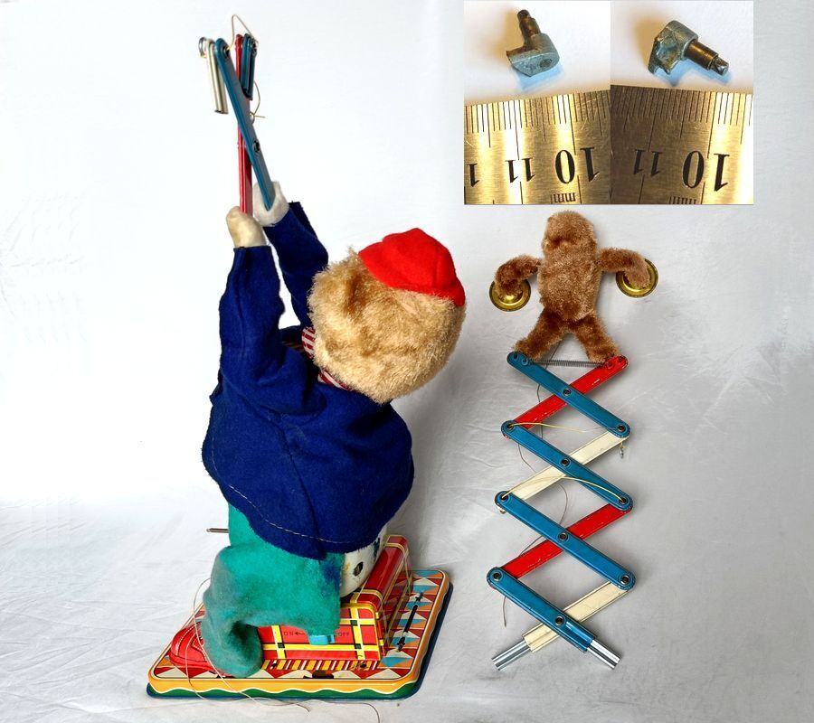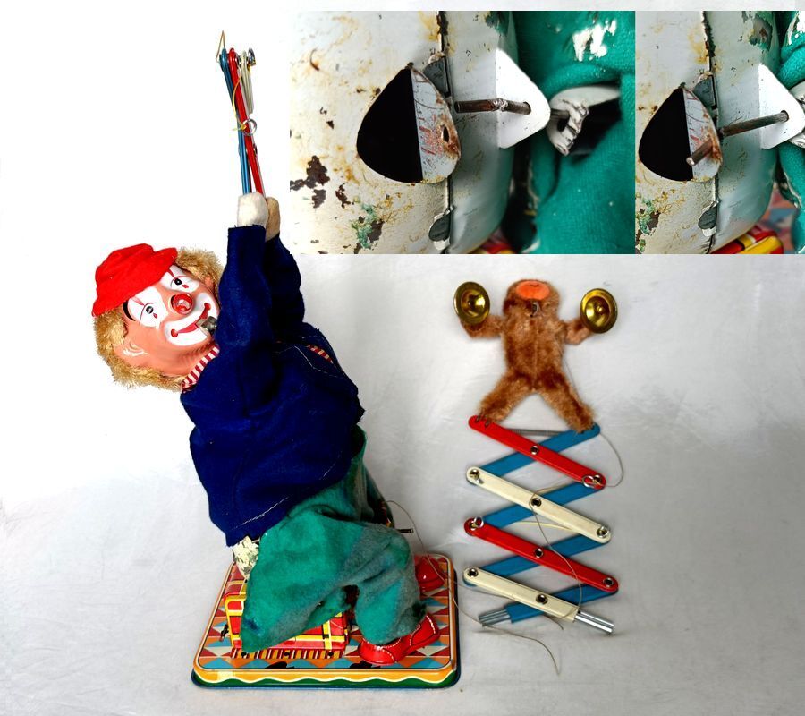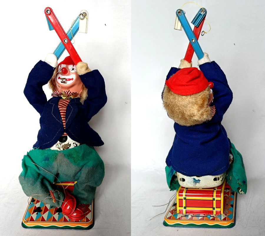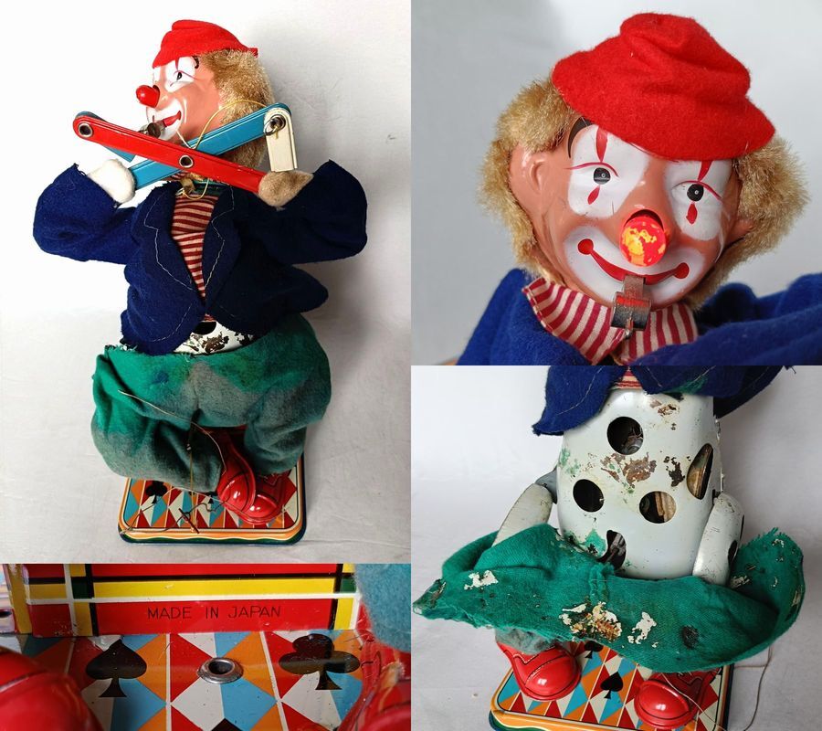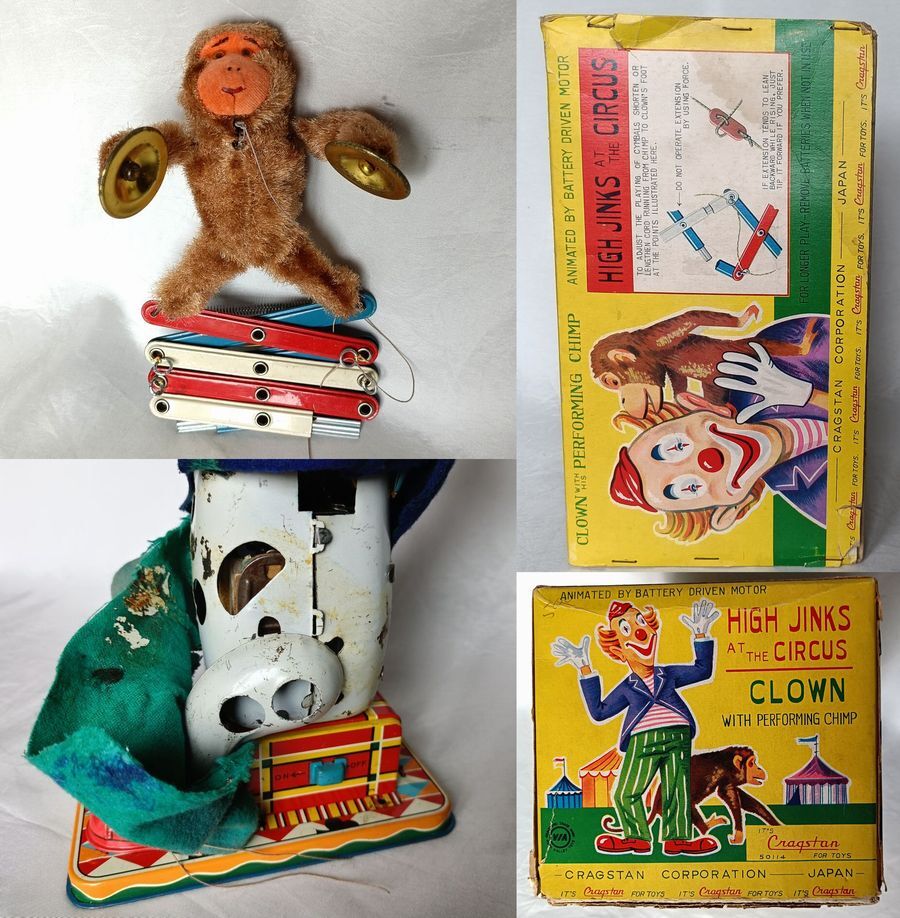 「HIGH JINKS CIRCUS CLOWN」 箱付きですが 一部部品の脱落があり作動しません。 ◎ 外観状態 : 添付写真3枚目右上に約10-15mm程の部品がおもちゃの 中から出てきました。 パンツを開け確認しましたが、脱落個所は不明です。 パンツはこのままの状態にてお送りします。 ブリキの部品(胴体)各所にペイント剥がれあり。 2枚目写真右上 右脚用針金に修理跡あり、固定や 駆動方法等不明。 7枚目写真左下 胴体合わせ部の爪欠損あり。 モンキーと繋ぐ糸が切れている。 この他の不具合不明。 バッテリーケースはきれいです。 ◎ 作動状態 : 単一*2本使用 ①お腹から出ている針金が回転 ②ピエロの鼻が点灯 (赤ペン一部脱落) ③時々ホイッスルがなります。 ④モーターは回転ギャー音はします。 以下不作動 ①頭部の回転 ②右脚が動かず ③モンキー動かず ④ラダーの伸び縮み ◎ オリジナルボックス : 添付7,8枚目写真参照 小さな破れはありますが、欠損部はありません。 概略サイズ 285*170*160mm | ||||