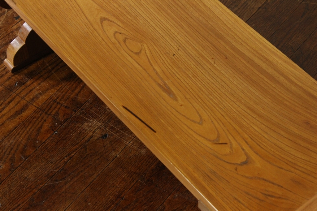 | 商品紹介 | 古い木製机。 使い込まれた使用感がいい感じで素敵です。 天板は一枚板、欅材が使われています。 お店・会社の軒先・お庭などと用途様々かと思われます。 |