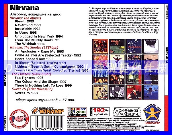 この商品は、音楽データ販売です。 ご入札の際はご注意ください。★自己紹介欄★ に、お知らせ等を記載いたしますのでご覧ください。 【特別提供】NIRVANA 大全巻 MP3[DL版] 1枚組CD◇ ロシアの音楽ショップで通常販売されているコレクターズ版を 特別提供仕様の音楽データ版でお届けします! ※(ロシアにて許諾を受け販売されている商品です。) パソコン(Windows/Mac)などで再生いただけます。 下記の商品説明よくご確認いただき、ご入札をお願いいたします。 当商品はコレクターズ版(ベストセレクションアルバム)となり、 収録曲がオリジナルアルバムと異なる場合もございます。 (音楽に関するデータベースサイト等と異なる場合もございます。) 以上をご理解、ご確認の上、ご入札をお願いいたします。