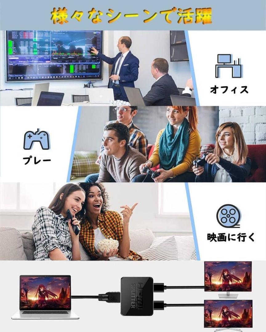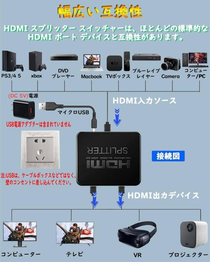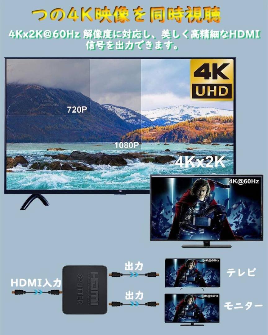 Yasoku HDMI 分配器 1入力2出力 二股 お好みの2台のディスプレイに同時出力可能 スプリッター て複数画面出力可能 hdmi 増設 オーディオ同期 PS5/Xbox/HDTV/DVD/PC/fire tv stick/PC/HDTVなど幅広く対応(高速1.5Mの2.0HDMIケーブル&USB電源ケーブル付き) 【HDMI 分配器 同時出力】HDMI スプリッター 1入力2出力は、2つの画面で同じ出力を複製するように設計されています- HDMI スプリッター 2画面同時出力 あなたはビデオとオーディオを同時に、損失なしで、遅れなしで得るでしょう。【複製するだけで、2つの異なる出力は提供されません】 【HDMI分配器 4k】HDMI入力、出力が4K、HDMIケーブルが高品質の場合、両方のモニターがすべて4Kで動作します。HDMI スプリッター 1入力2出力は、4k@60Hz をサポートし、2k/1080p と下位互換性があります。遅延なし、画質や音質の低下なし。(インターフェースを挿入しても信号がないと表示される場合は、モニターの解像度を調整してください。) 【入/出力機器の互換性】HDMI分配器 拡張モード対応 サポート入力: コンピューター、パソコン/PC、MacBook、メディアボックス、PS5、pro、PS4、Switch、XBox、Fire TV、ROKU、Blu-Ray DVD プレーヤーなど。出:HD或全HD TV、器、投影机等。このHDMI二股分配器はほとんどのデバイスと互換性があります。 【プラグアンドプレイ接続簡単】サイズ:63mm*48mm*14mm 小さなHDMIスプリッター1入力2出力は外部ドライバーが不要で使いやすく、持ち運びが簡単で、旅行に便利です。 【包装内容】① 1 x HDMI 分配器 1入力2出力 ② 1 x HDMI ケーブル (1M)③ 1 x 電源ケーブル (USB 電源アダプターは含むない)④ 1 x 取扱説明書。 >