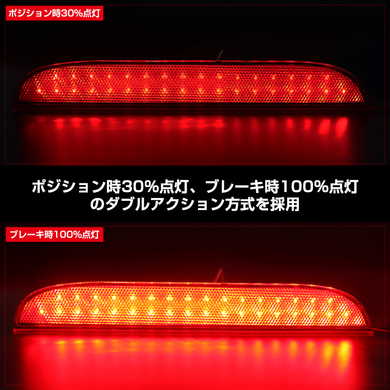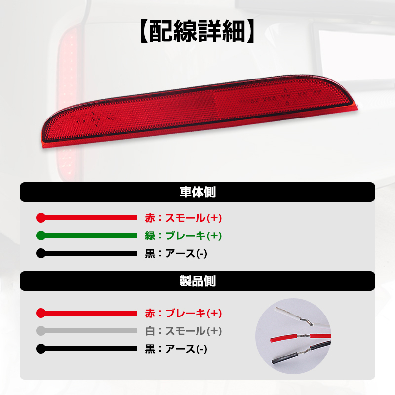 | 商品説明 | ポジション時30%点灯、ブレーキ時100%点灯のダブルアクション方式を採用 リアビューに存在感を放ち、追突防止にも役立ちます。 【配線詳細】 |