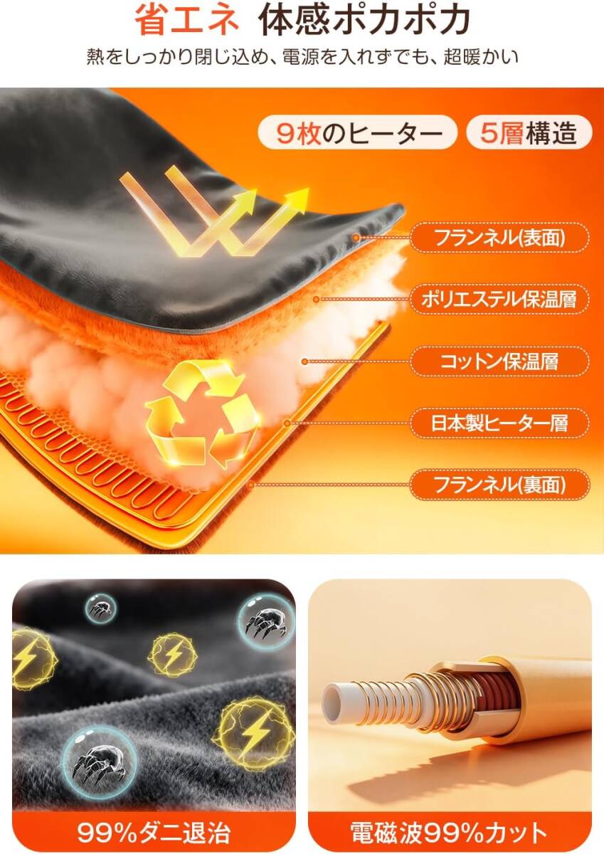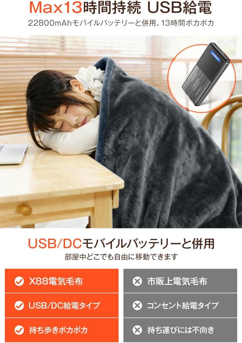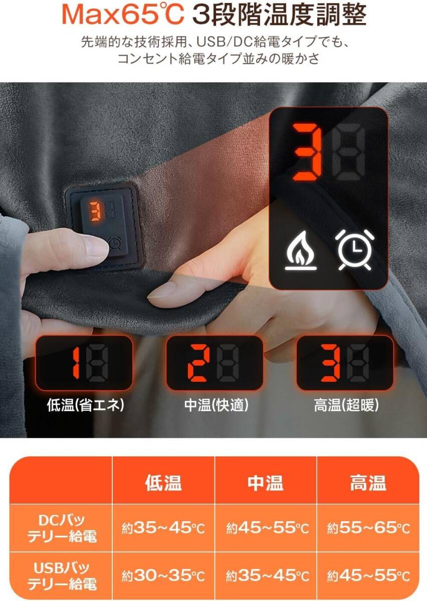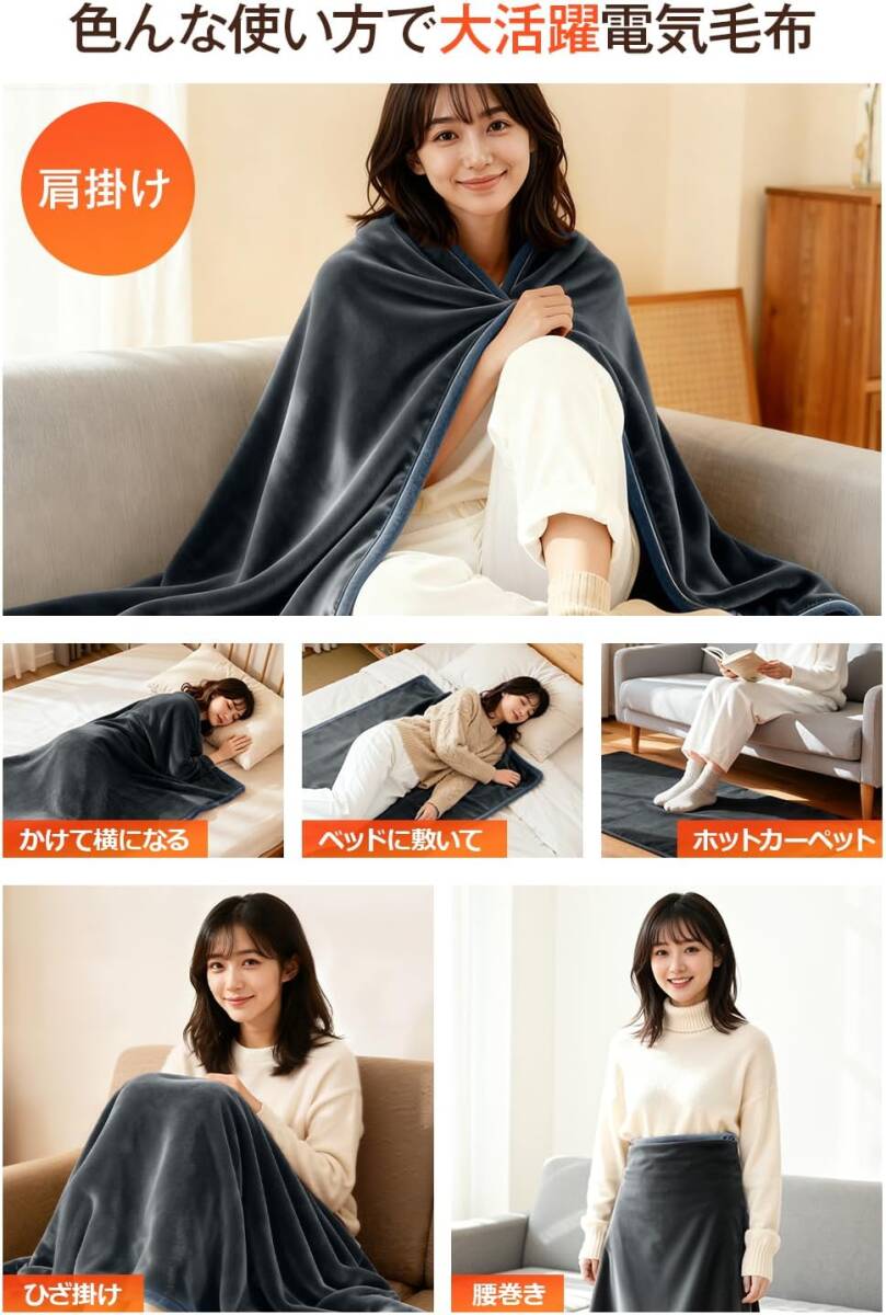 電気毛布 掛け敷き兼用 【9箇所発熱 143×88cm大判】 USB/DC給電 電気ブランケット 電気ひざ掛け 22800mAhバッテリ國際運送規定電池為危險物品,無法運送,購買後會幫您取出丟棄。 ー付 3段階温度調節 MAX65℃ 日本製ヒーター 6Hタイマー 肩掛け 膝掛け 敷毛布 腰巻き ダニ退治 切り忘れ防止 丸洗い可 防寒対策 暖房器具 速暖 ブランケット 省エネ キャンプ 車中泊 アウトドア オフィス (グレー バッテリ國際運送規定電池為危險物品,無法運送,購買後會幫您取出丟棄。 ー付き) 【9箇所同時発熱・一枚多用大判電気毛布】※ 電気毛布+モバイルバッテリ國際運送規定電池為危險物品,無法運送,購買後會幫您取出丟棄。 ー2点セット ※ 9つの内蔵ヒーターが配置され、モバイルバッテリ國際運送規定電池為危險物品,無法運送,購買後會幫您取出丟棄。 ーなどから給電しながら、じんわりと体を温めるUSB式電気毛布です。143×88cmの大判サイズで、ひざに掛けたり、肩に羽織ったり、冷えやすい足元に覆ったり、腰を巻いたり、使い方色々な掛け敷き両用ブランケット。軽くて持ち運び便利、自宅はもちろん、車中泊やアウトドアなど、様々なシーンで活躍。冬の寒さ対策だけでなく、春や秋の少し肌寒い時期、そして冷房で体が冷える夏場の室内など一年中活用でき、災害時の停電対策や、屋外イベントでの防寒アイテムとしても重宝されます。 【3段階調温・6時間タイマー・22800mAh大容量バッテリ國際運送規定電池為危險物品,無法運送,購買後會幫您取出丟棄。 ー付属】毛布に設置されたボタンを押すだけで、温度とタイマーを設定することができます。低・中・高の3段階から温度調節が可能で、冷え具合に合わせてお好みの暖かさを自由に切り替えられます。さらに、0H(タイマー設定しない)、1H、2H、3H、4H、5H、6Hに設定可能なオフタイマーを備えており、付けっぱなしを防止し、就寝時などに便利です。つい電源を切ることを忘れることなく、ウトウト眠ってしまうときも低温やけどや消し忘れによる事故を防ぐため、高齢者の方も安心してお使いいただけます。 【USB/DC給電・MAX65℃発熱・丸洗い可能】USBとDC端子の2way給電方式を採用。USBモードでは体温維持に最適な40℃前後の安定発熱を実現。DCモードでは家庭用コンセント並みの65℃まで急速昇温するため、極寒地域での使用におすすめ、ダニ退治にも役立ちます。さまざまな寒い環境に確実な暖かさを提供し、厳しい冬の寒さを撃退、寒がりの方に適しています。汚れた場合、バッテリ國際運送規定電池為危險物品,無法運送,購買後會幫您取出丟棄。 ーを取り外し、電気毛布を洗濯ネットに入れて、洗濯機で丸洗いできますので、いつでも清潔にお使いいただけます(※乾燥機や洗濯機の乾燥機能は使用しないでください)。 【速暖と安全性を両立・ふわふわ柔らかい肌触り】日本製繊維ヒーターを採用し、熱伝導率が高く、より高速かつ安定に発熱する暖房毛布です。電源を入れてすぐ温まり始め、暖かさが効率よく広がります。5層構造の高密度保温設計により、熱を逃さず、温かい空気をしっかり閉じ込め、まるで着るこたつのようにポカポカが持続します。両面フランネル素材で、柔らかくさわり心地がよくて、折りたたんでもシワになりにくい。電源を使わず、通常のひざ掛けや肩掛けとして普通に使っていても暖かい。防寒対策として、冬の寒さを乗り切るおともにぴったりです。 【幅広く適用・冬には素敵なプレゼント/ギフト】肩、腰、お腹、もも、膝、足など全身のあたために使用でき、ベッドやソファ、オフィス、車内、テント内、屋外活動、アウトドア、スポーツ観戦など幅広く適用、寒い冬でも快適に過ごすことができます。【パッケージ内容】電気ブランケット、モバイルバッテリ國際運送規定電池為危險物品,無法運送,購買後會幫您取出丟棄。 ー、取扱説明書。 >