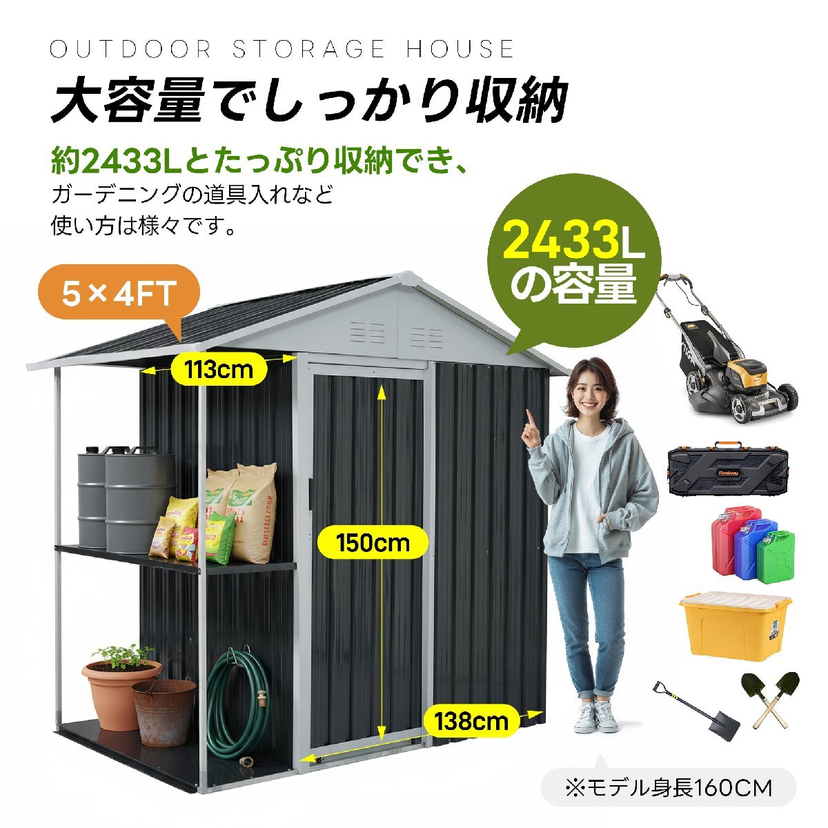 ◎01【1台の物置、2種類の収納方法】左側は収納ラックで、よく使う道具をすっきり整理。右側は1775Lの収納スペースで、大型用品もしっかり収納できます。 ◎02【収納ラックか?プランターラックか?】日用品を整理できる収納ラックとしても、グリーンを飾れるプランターラックとしても活躍します。限られたスペースを有効に使える、多機能タイプの物置です。棚板の耐荷重:5kg 上段の棚板は三段階で調節可能です。 ◎03【大容量でしっかり収納】約2433Lとたっぷり収納でき、ガーデニングの道具入れなど使い方は様々です。5×4FT 138*113*156cm 約2433Lの大容量 ◎04【ハンドル含有安全氣囊的方向盤,無法協助運送購買,若無含安全氣囊,按下確認即可下標。 付き引き戸】開く時にドアを開けるスペースがいらないので、狭い場所でもスムーズにアクセスできます。扉サイズ:58*150cm
