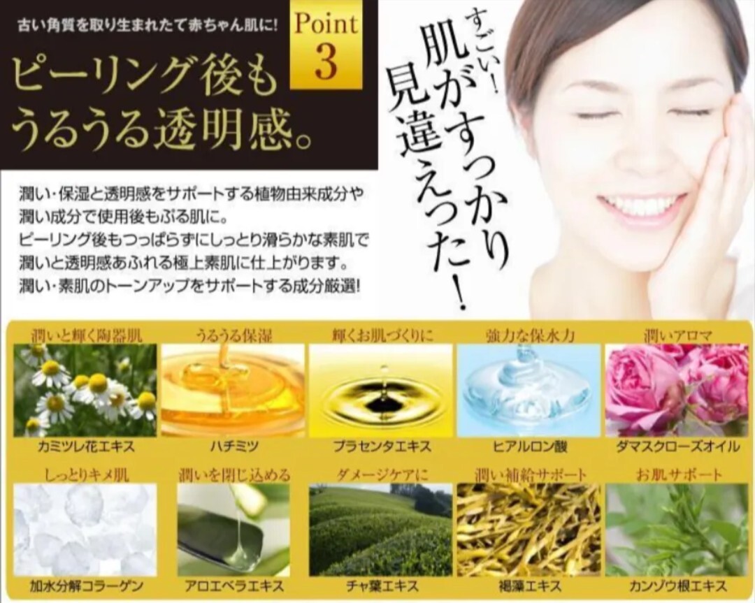 ダイヤモンドパウダーと4種の酵素により、お肌に負担をかけず、古い角質を、やさしく・滑らかに・しっかり取ることります。