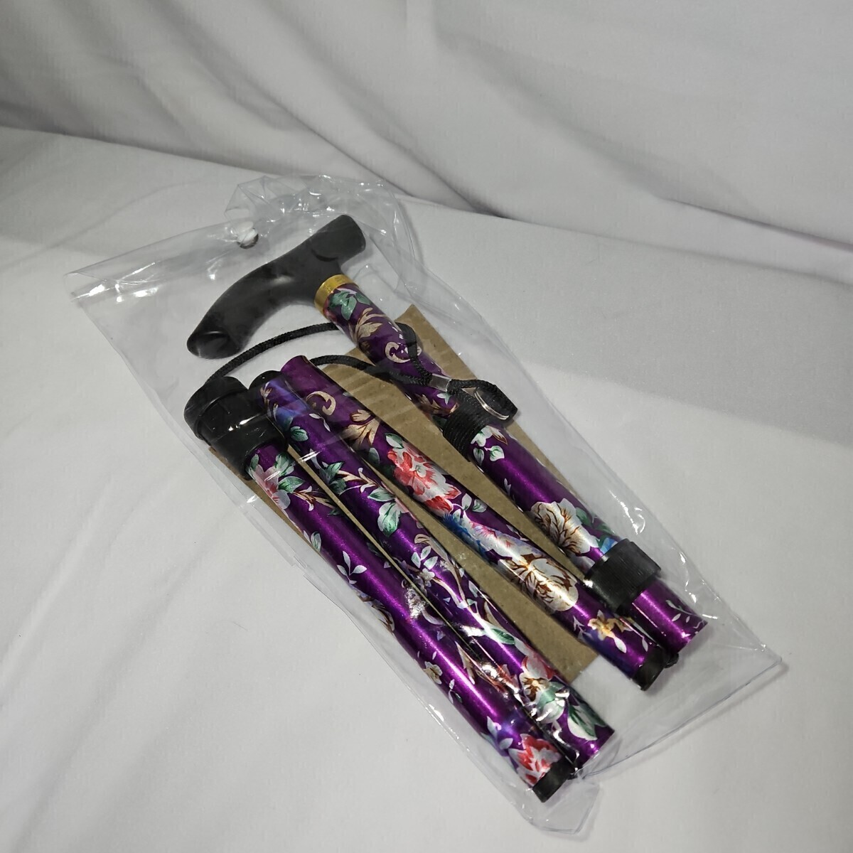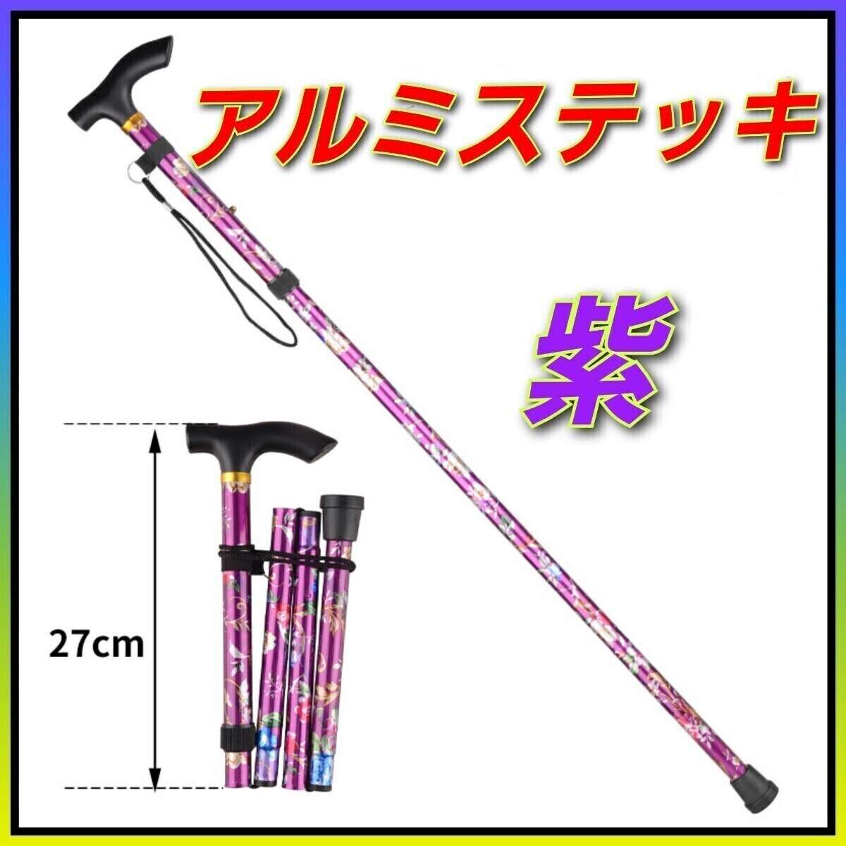 杖 ステッキ 軽量 折りたたみ 伸縮式 調整 つえ 花柄 パープル