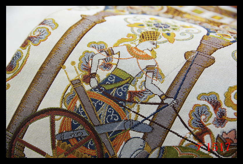 ○『紹巴』織は、高級品として代表的な「つづれ織」に似ていて、緯糸(ぬきいと)が経糸(たていと)を包み覆うような織り方であり、緯糸によってのみ、柄デザイン・配色を織り上げています。