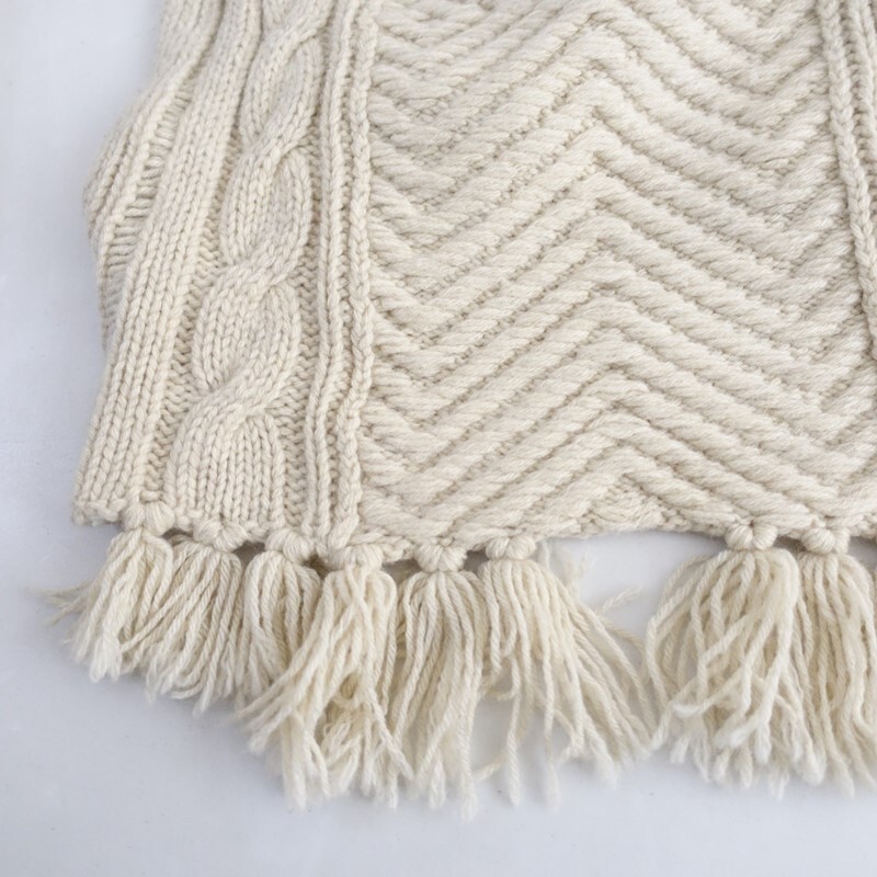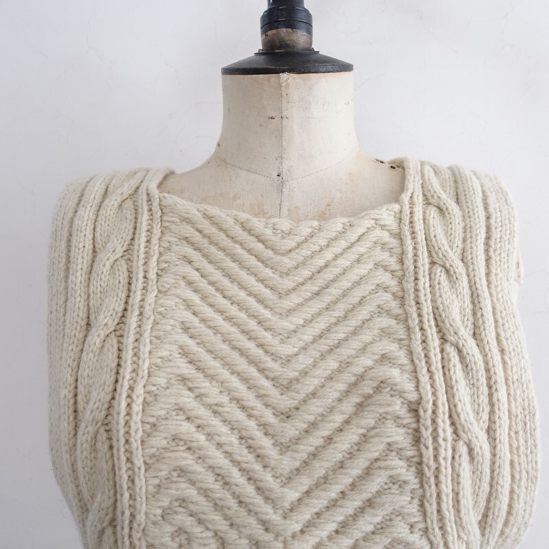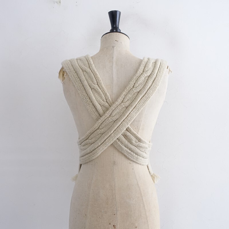 | WONDER FULL LIFE×TAKtのウールケーブルニットベストです。カラーはアイボリーです。太いウールヤーンで手編みされたバックレスのベストです。ケーブル編みなど立体的な編み模様があしらわれ、裾はフリンジ仕様です。バック紐はクロスに配し、取り外しや調節は不可です。ポケットはございません。定価(メーカー希望小売価格)39,600円の商品です。 |