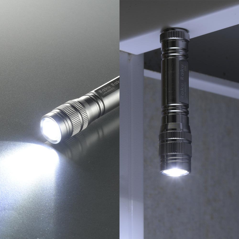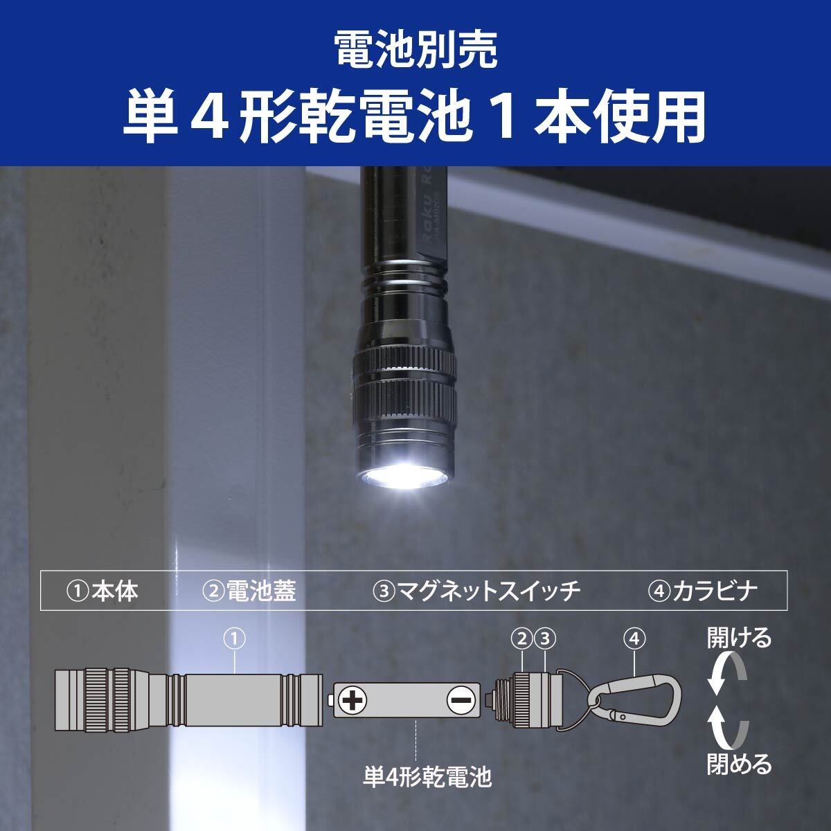 【 特 長 】 ● マグネットスイッチを外すだけで光る、ラクラクスイッチ ● カラビナと本体の接合部分がマグネットスイッチになっています ● カラビナをベルトやカバンに付けたまま本体を引っ張り、マグネットスイッチからはずして点灯、もどして消灯 ● 照度は約4300ルクス(照射距離10cmの場合) 【 仕 様 】 ■ 使用電源:単4形乾電池1本(電池別売) ■ 使用光源:LED(交換できません) ■ 光束(ルーメン):約22ルーメン ■ 連続使用時間:約6時間※新品未使用の電池使用時、電池の性能や使用状況により異なります ■ 外形寸法:(約)最大径19×長さ92(mm) ■ 質量:約33g(電池別)