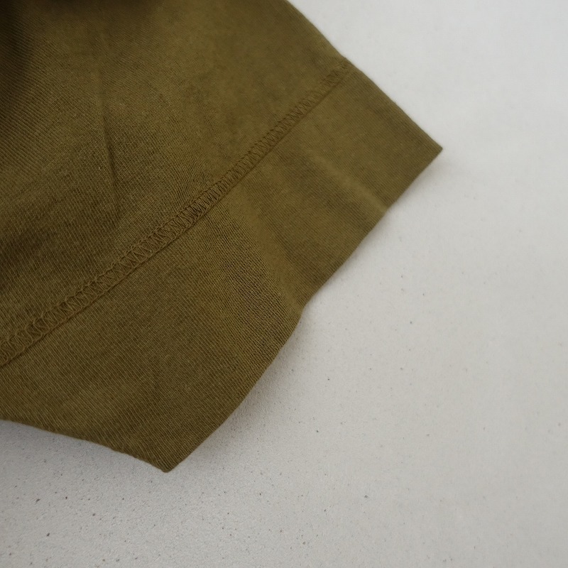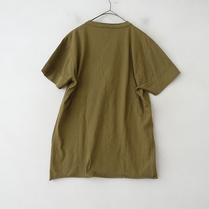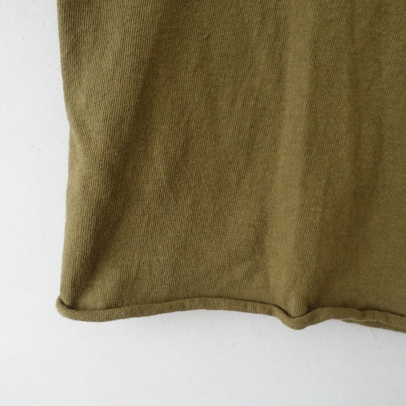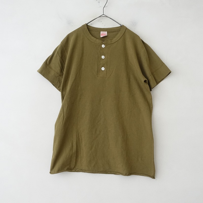 | Healthknitのヘンリーネックコットン半袖カットソーです。カラーはグリーン系カーキです。襟元のボタン開閉のプルオーバータイプで、裾はカットオフロール仕様です。 |
