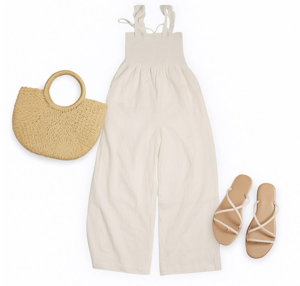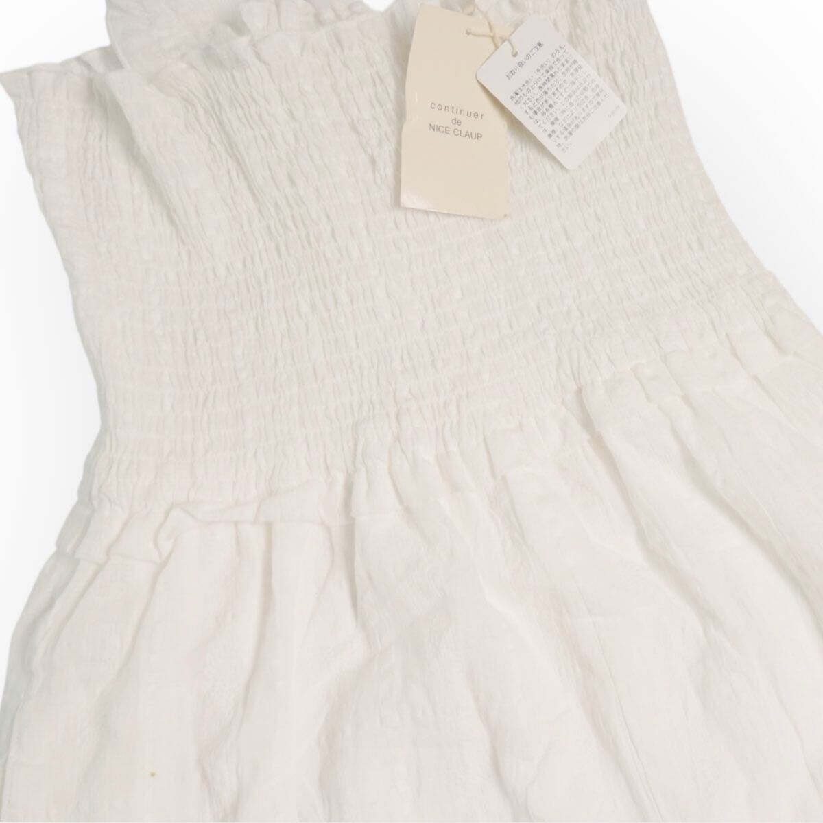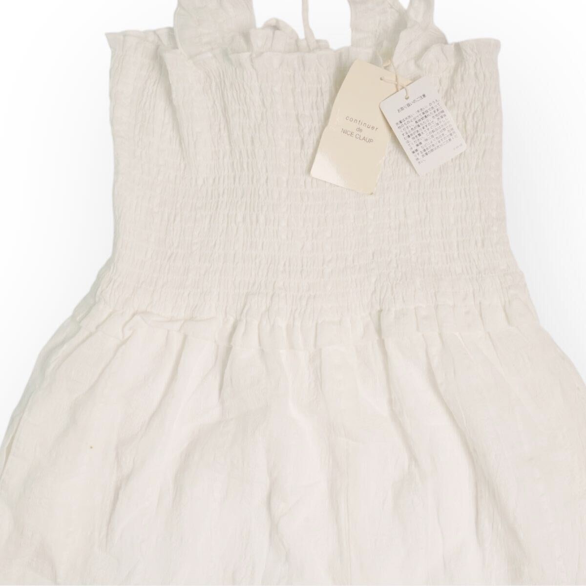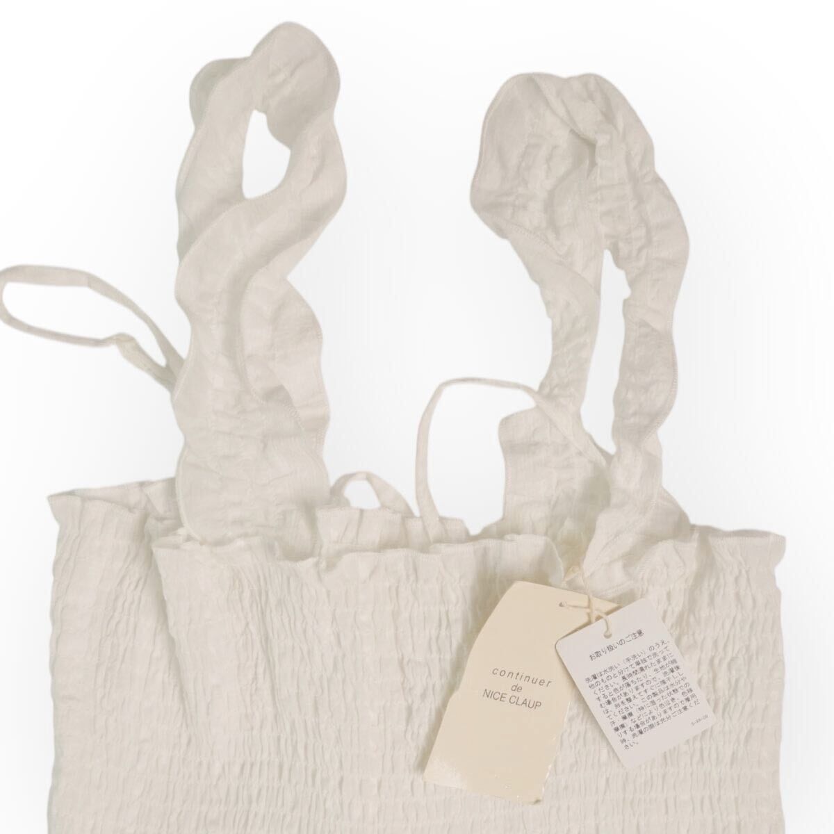 ■特徴 ・continuer de NICE CLAUP 正規品 ・シャーリング×肩リボンが可愛いナチュラルデザイン ・締め付け感のない楽な着心地 ・インナーを変えて着回し自在 ・サンダルやかごバッグとの相性◎