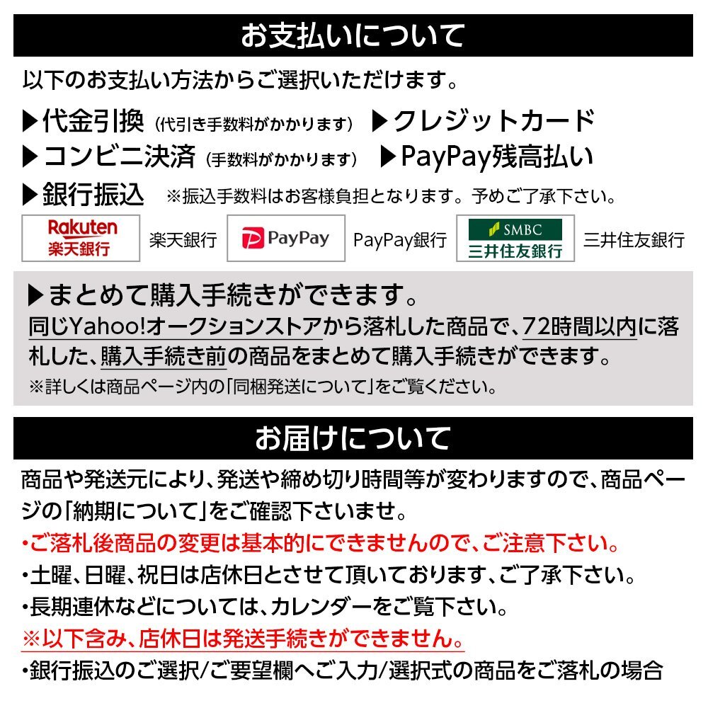 必ずパソコン版でご確認の上、ご入札下さい。 ・発送が完了いたしましたら、ご登録アドレスへ配送番号をご連絡いたします。迷惑メールフォルダも併せてご確認ください。 ・納品領収書は発送完了メール内よりダウンロード可能です。 代金引換・コンビニ払いに限り納品書のみダウンロード可能です。 ・土日祝日や当店休業日に頂きましたご注文への確認メール、発送や商品に関するお問い合わせへのお返事は、原則として翌営業日、又翌週月曜日となりますので、予めご了承下さいませ。 ・落札後1週間以内に支払い・入金がない場合は「落札を削除」致します。 |