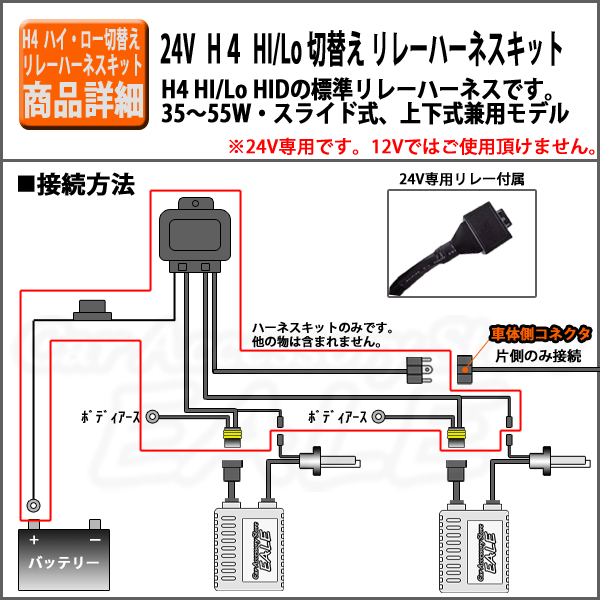 24V専用 H4 HI/Lo HID用のリレーハーネスキットです。