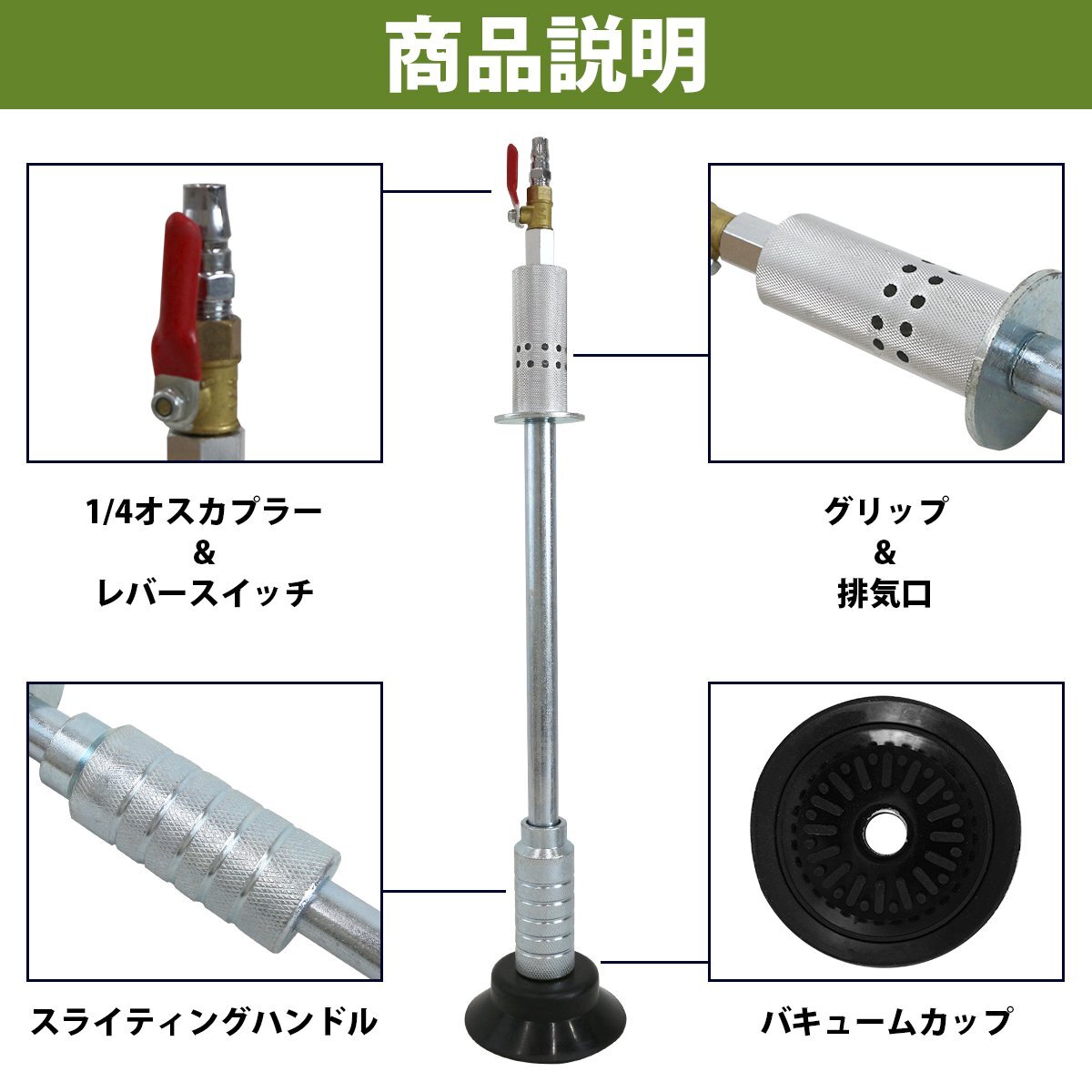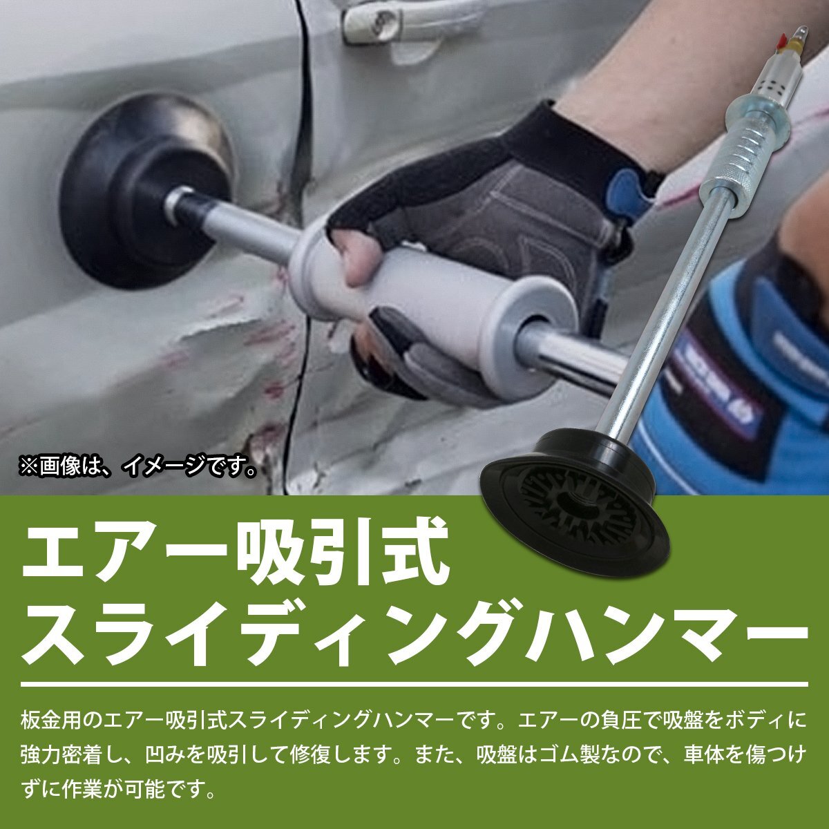 商 品 説 明 エアー吸引式スライディングハンマー! ・エアーの強力な負圧により、大きく凹んだボディを素早く修復できます。 ・凹み商品可能有凹損、塌陷,請下標前詢問清楚且注意。 の仮修正や粗出し作業に最適です。 ・吸盤はゴム製なので、車体を傷つける心配はありません。 ・1/4カプラー付