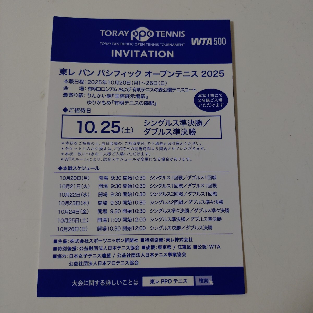 | 商品名稱 : | 東レ パン パシフィック オープンテニス2025 10月25日(土)シングルス準決勝・ダブルス準決勝 ペア招待券 |