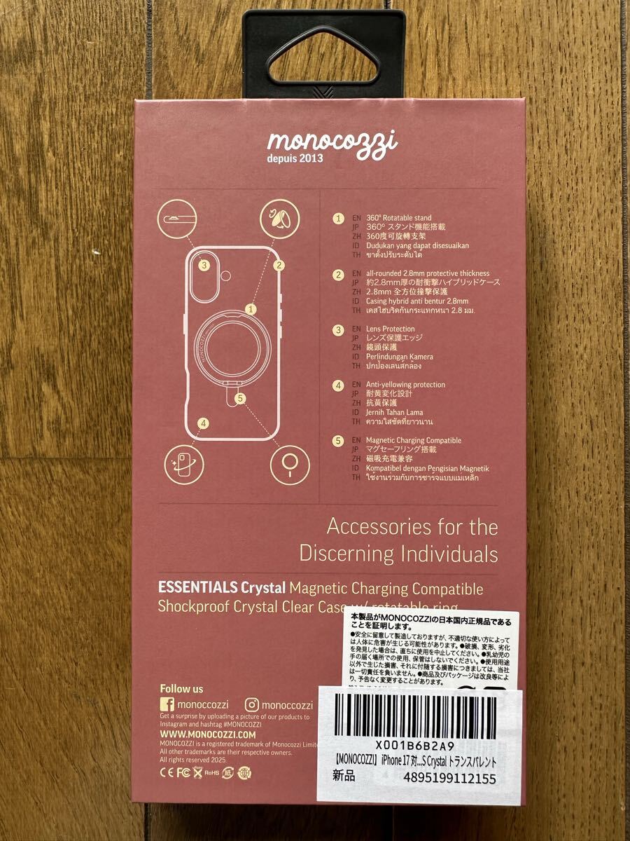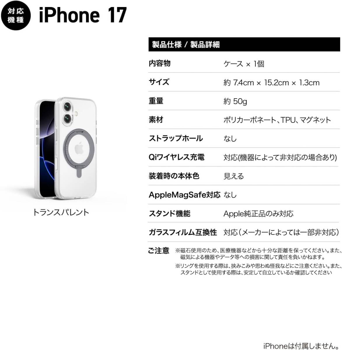 【製品仕様】… ◆ 対応機種 : iPhone 17 ( アイフォン17 ) ◆ 内容物 : ケース × 1個 ◆ サイズ : 約 15.2cm × 7.4cm × 1.3cm ◆ 重量 : 約 50g ◆ 素材 : ポリカーボネート、TPU、マグネット 【製品特徴】… ◆ ストラップホール : なし ◆ Qiワイヤレス充電 : 対応(機器によって非対応の場合あり) ◆ 装着時の本体色 : 見える ◆ カード収納 : なし ◆ MagSafe対応 : Apple純正品のみ対応 ◆ ガラス易碎品限空運,非易碎品可使用海運。 フィルム互換性 : 対応(メーカーによっては一部非対応) ◆ ご注意 : ※磁石使用のため、医療機器などから十分な距離を保ってください。また、磁気による機器やデータ等への損害が生じた場合責任を負いかねます。 ◆ ご注意 : ※リングを使用する際は、挟みこみや思わぬ怪我などにご注意ください。また、スタンドとして使用する際は、安定して自立しているか確認してください 【クリアな美しさ】… 本体デザインを楽しめるように、クリスタルのように透き通ったPCを使用。黄ばみにくく美しさが続きます。 【360°回転のグリップスタンド】… 一体型のリングは360度回転可能で、持ちやすさも動画視聴もスマートにサポートします。 【耐衝撃】… 厚さ約2.8mmの薄型設計でありながら、約2.6mの落下試験をクリアした耐衝撃ケースです。 >