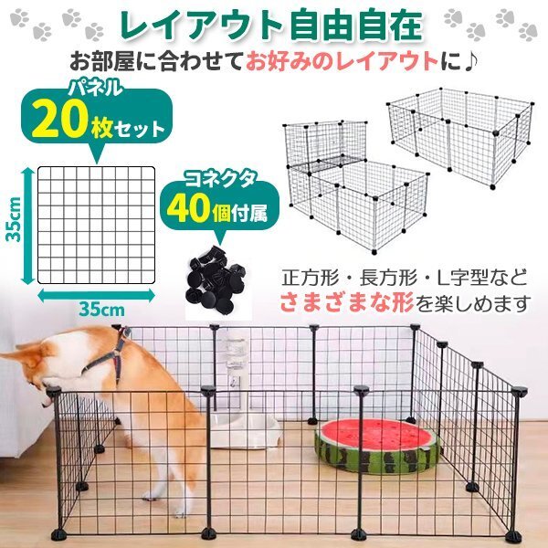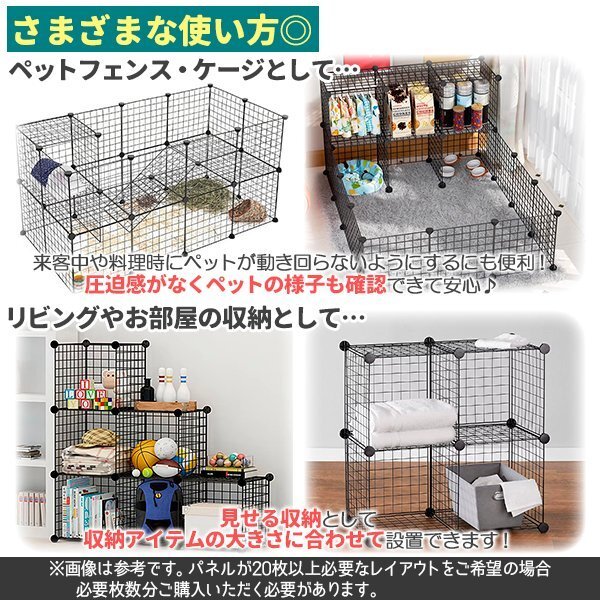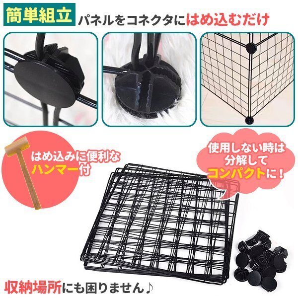 商品内容 ジョイント式 ペットフェンス 20枚セット レイアウト自由自在 お部屋に合わせてお好みのレイアウトにすることができます。 1枚が約35cmx35cmの20枚セットで正方形・長方形・L字型など色々な形を楽しめます。 コネクタにはめ込むだけの簡単組立 はめ込むときに便利なハンマーを付属します。 使用しない時は分解してコンパクトに 場所に困らず収納も出来ます。 ペットフェンス、ケージとして利用◎ 来客中や料理時にペットが動き回らないようにするにも便利 メッシュ仕様で圧迫感がなくペットの様子も確認できて安心です。 リビング、お部屋の収納として利用◎ 見せる収納として、モノの大きさに合わせて設置できるのが特徴 【商品詳細】 パネルサイズ(約):35cmx35cm ひとマスのサイズ(約):4.4×4.4cm 総重量(約):5kg 【セット内容】 パネル:20枚 コネクタ:40個 組立時に便利な小型ハンマー付き! ※お客様にて組立が必要な商品です。 ※画像は参考です。パネルが20枚以上必要なレイアウトをご希望の場合、必要枚数分ご購入いただく必要があります。 【注意事項を予めご了承ください】 ●入荷時期により、若干デザインや仕様が変わる場合がございます。 ●手作業での採寸となりますので、若干の誤差が生じます。 ●輸入品のため、小傷・擦れ・汚れ・変形・ヘコミ商品可能有凹損、塌陷,請下標前詢問清楚且注意。 ・縫製のムラ等などが付いている場合があります。 ●取扱・取付説明書等は付属しておりません。 ●販売のみとなりますため、取扱・取付方法のお問い合わせ等は対応不可となります。 ●当商品を使用した事による他商品の破損・故障につきましては一切の責任を負いかねます。 ●作業中の事故・取付ミスによる破損に関しましては一切の責任を負いません。 ●お使いのモニター環境や撮影場所やイメージにより、実際の商品と色味が若干異なる場合がございます。