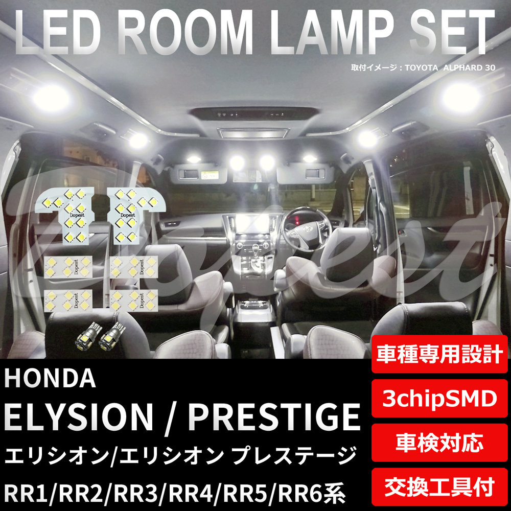 エリシオン/プレステージ LEDルームランプセット RR1-6系 車内 商品内容 全てにこだわったDopestオリジナルアイテム! フロント:10連3チップSMD×2 リア:6連3チップSMD×4 ナンバー灯:5連3チップSMD×2(無極性) 【計8点セット】 ◆樹脂製ルームランプ交換工具付き 適合 HONDA(ホンダ)エリシオン/エリシオン プレステージ[ELYSION/PRESTIGE] RR1/RR2/RR3/RR4/RR5/RR6系 カラー ホワイト(純白光)/6500Kクラス ※車検対応 注意点 純正LEDルームランプ(電球の取り外しが出来ないタイプ)の場合はお取り付け出来ませんのでご注意ください。商品のセット内容とお車の室内灯をご確認下さい。取り付けの際はルームランプユニットにマスキングテープを貼るなど保護対策をお願いします。パーツのお取り付けは自己責任でお願いします。パーツを取り付けたことによる事故・不具合等の一切の保証は致しかねます。 保証期間 商品ご落札日から1年間 ※取り付け破損、紛失、他部品、購入商品以外、工賃の保証などその他不可。